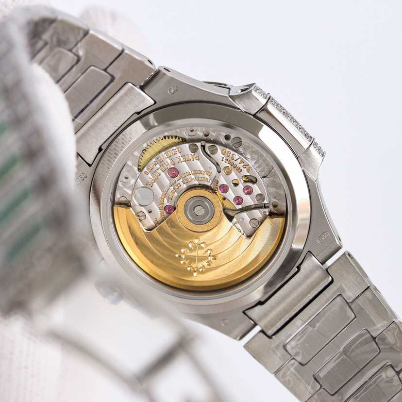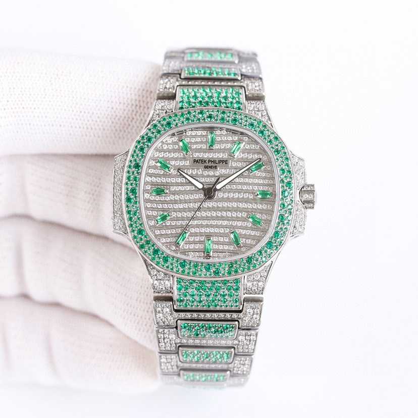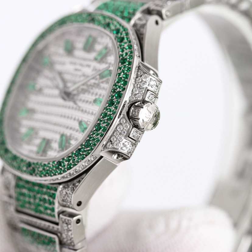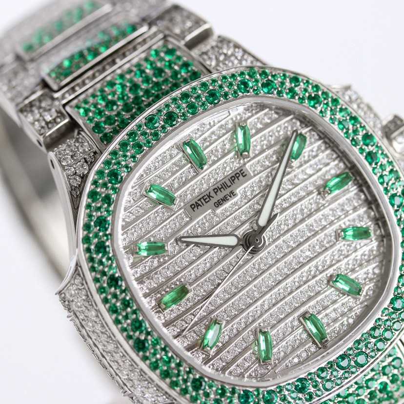 女士鹦鹉螺 满钻限量款 少量到货,三款7118满砖腕表分别镶嵌红宝石、蓝宝石、祖母绿三种不同色彩的宝石镶嵌,限量供应(全身采用八心八箭天然奥宝水钻)