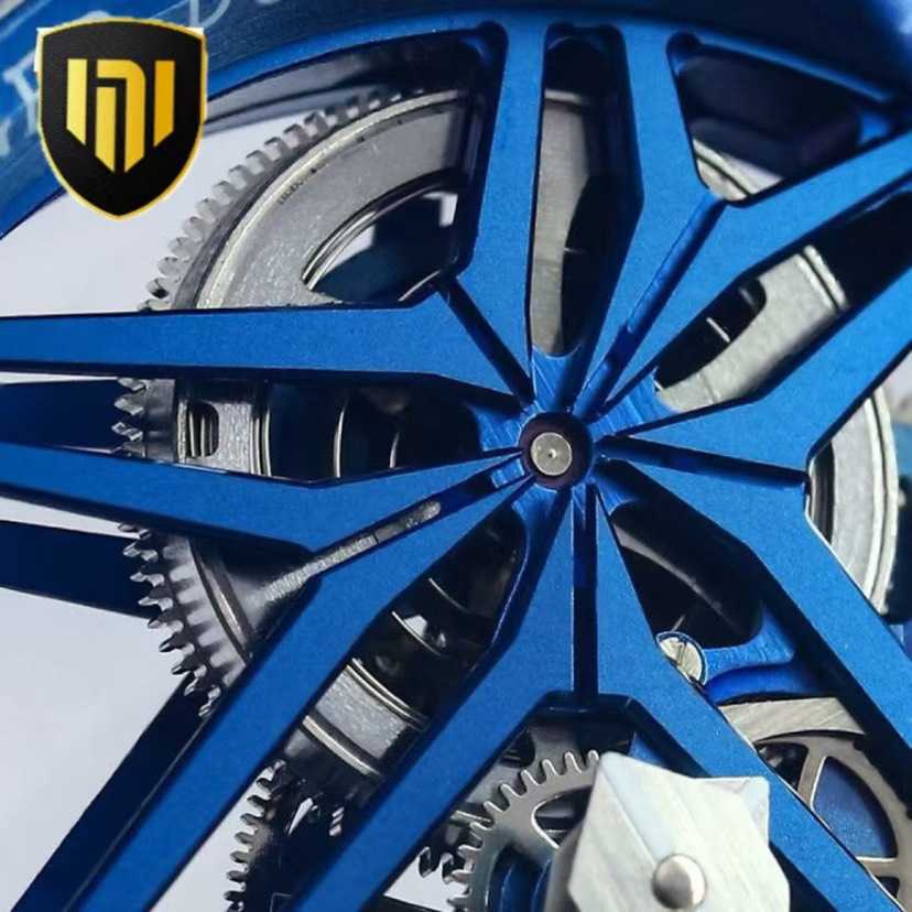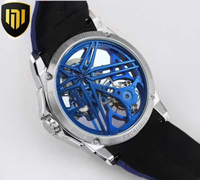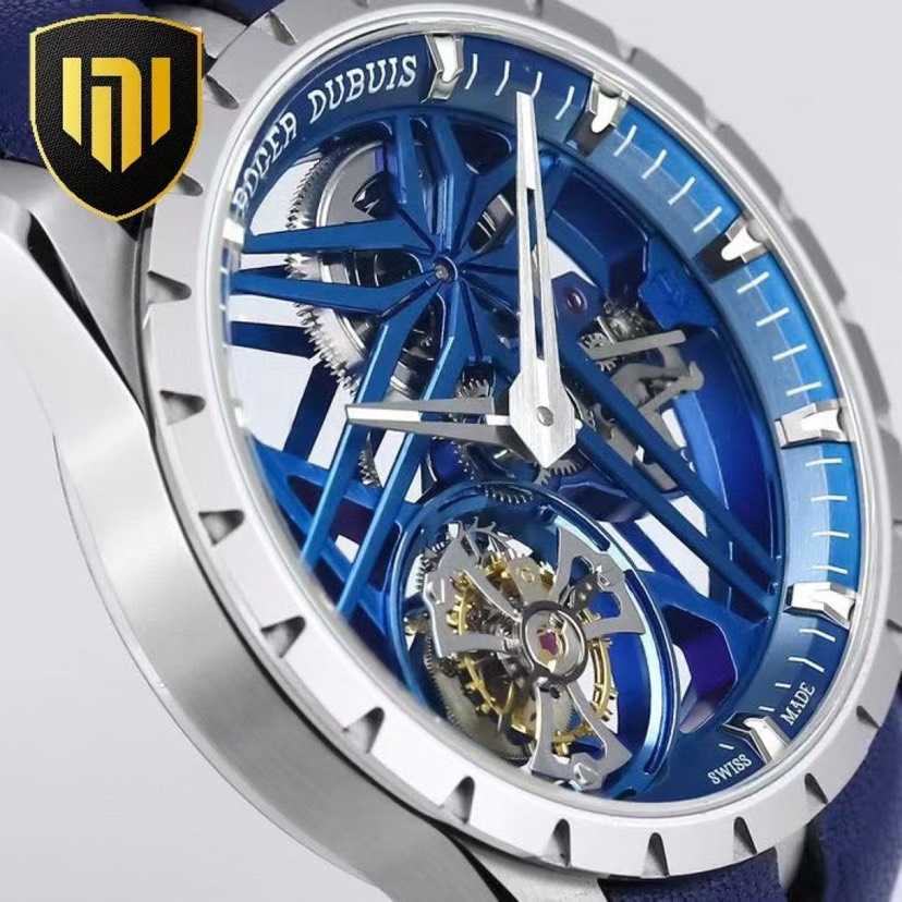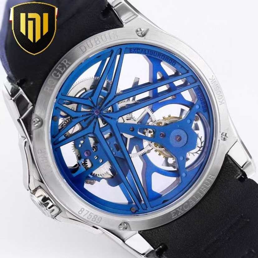 装饰悬浮于发条盒上方,镂空单飞行陀飞轮则位于7点钟方向,将罗杰杜彼的卓越制表技艺展现的淋漓尽致。