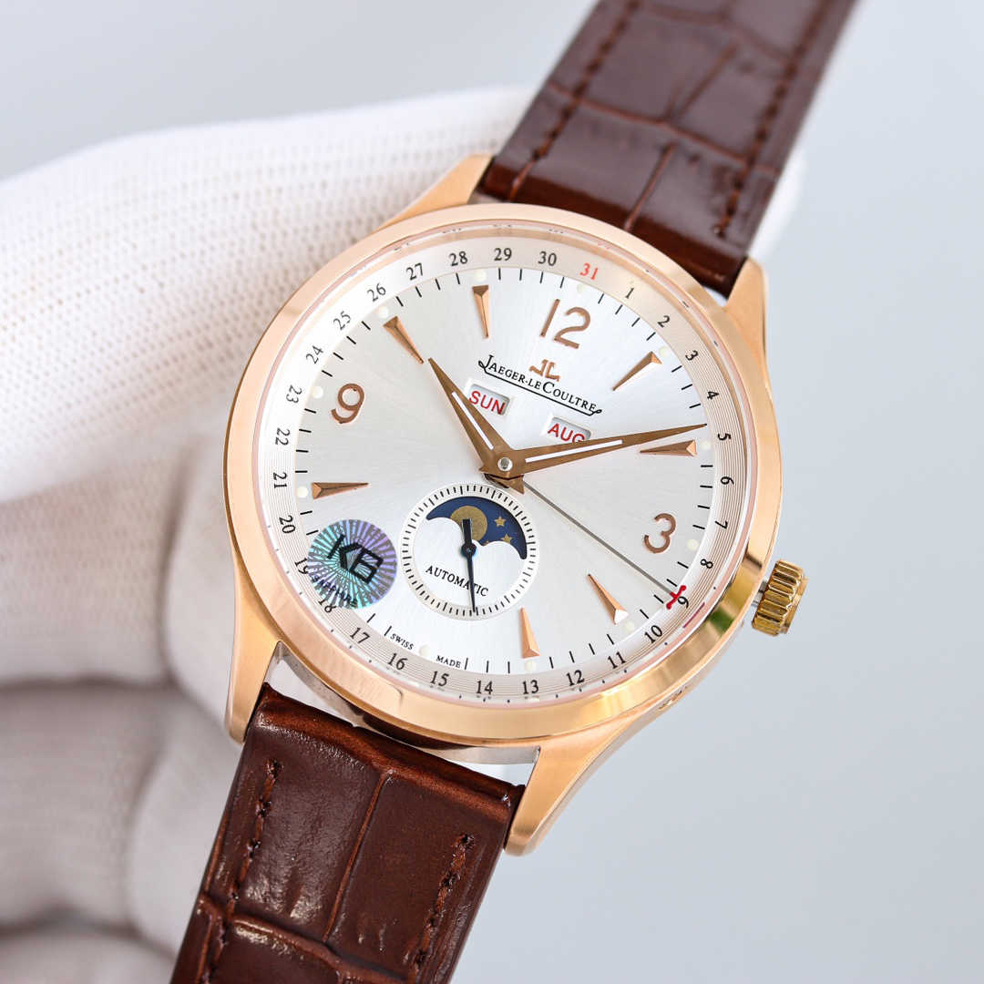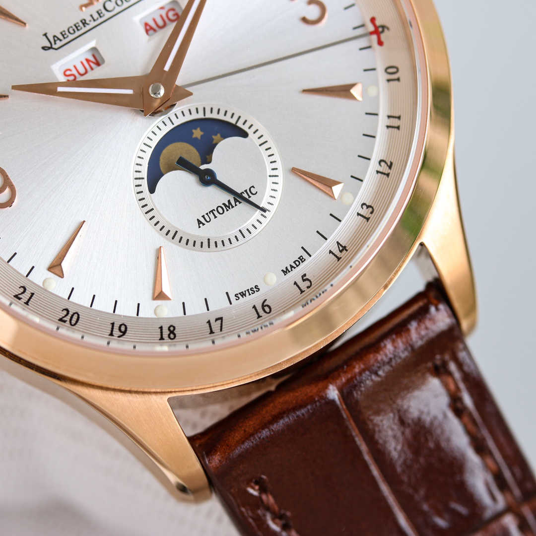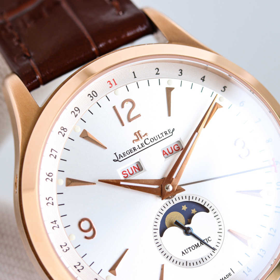 积家日历大师1558420系列,腕表十二点位置两个窗口分别显示星期和月份,腕表在6点钟位置的副表盘可读取月相显示,边缘位置则显示时钟!腕表前后均采用蓝宝石水晶玻璃,皮带采用进口意大利牛皮,表扣则与表壳同材质的原装折叠扣,机芯则搭载与一样866型自动上链机芯,最大能量度还原!