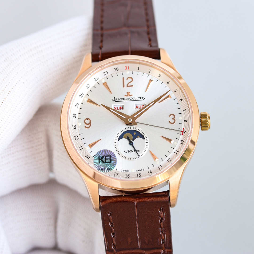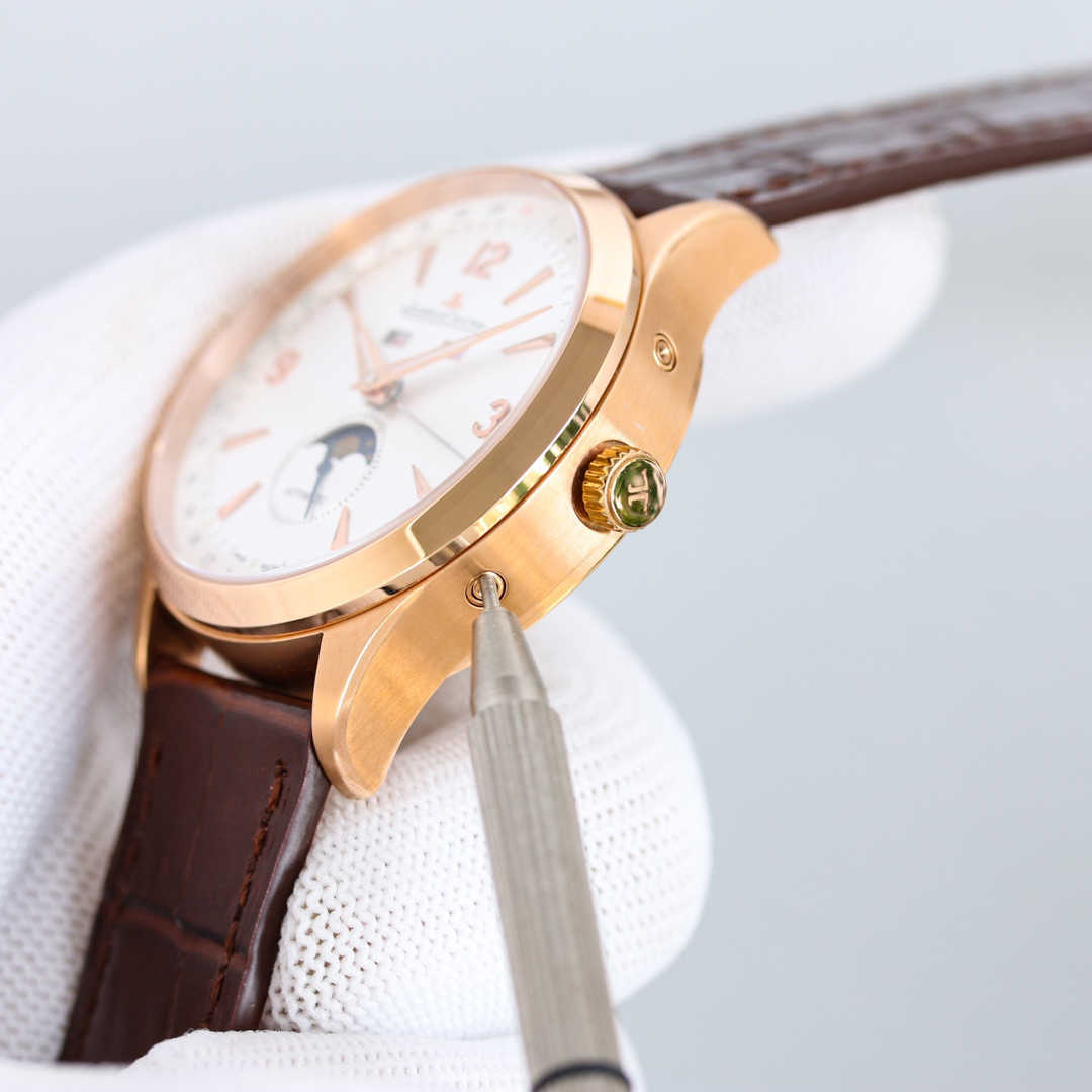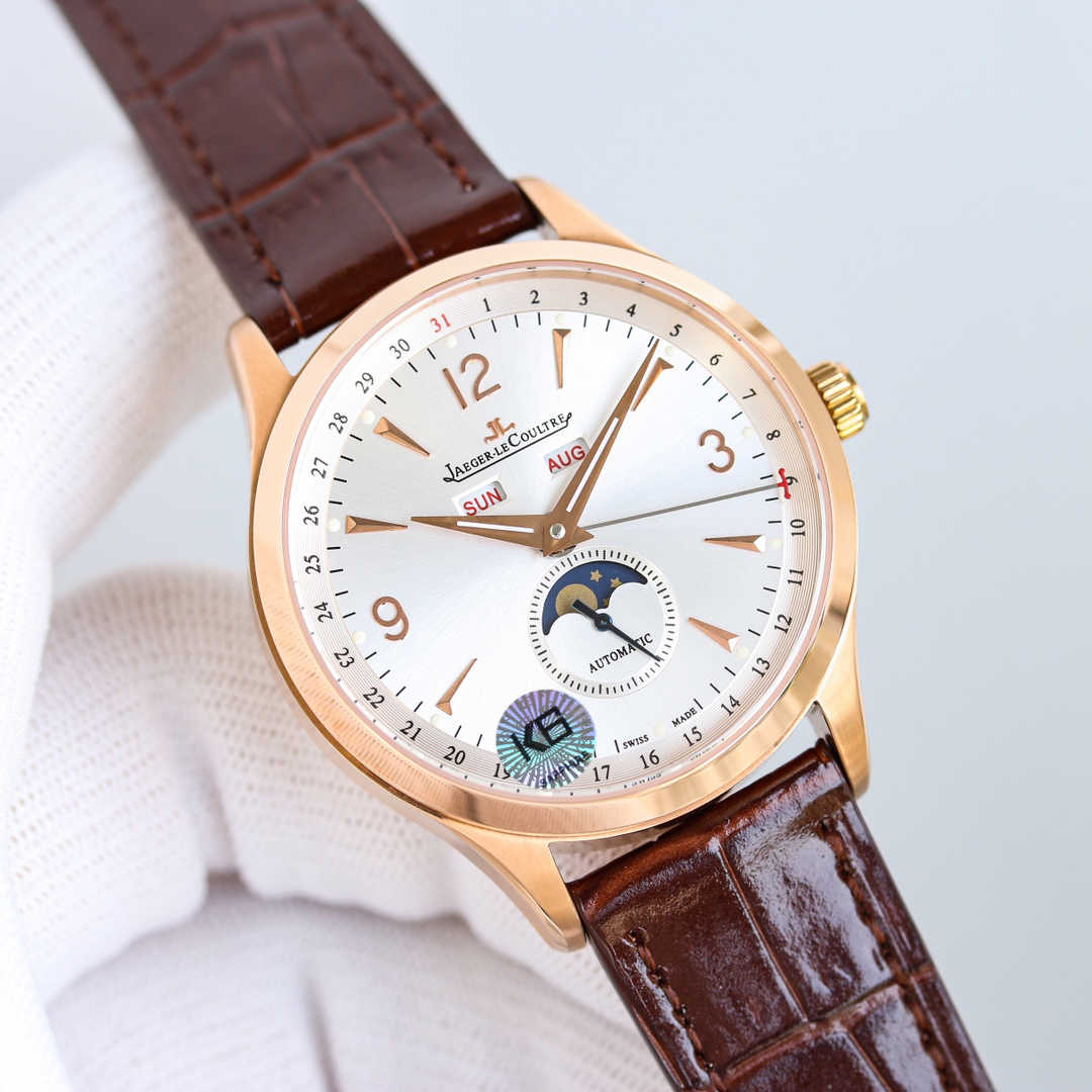 积家日历大师1558420系列,腕表十二点位置两个窗口分别显示星期和月份,腕表在6点钟位置的副表盘可读取月相显示,边缘位置则显示时钟!腕表前后均采用蓝宝石水晶玻璃,皮带采用进口意大利牛皮,表扣则与表壳同材质的原装折叠扣,机芯则搭载与一样866型自动上链机芯,最大能量度还原!