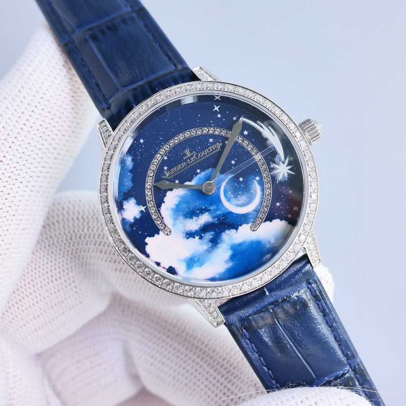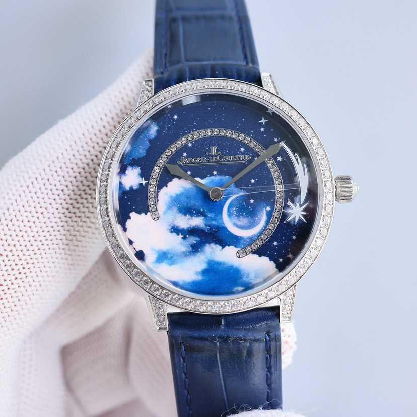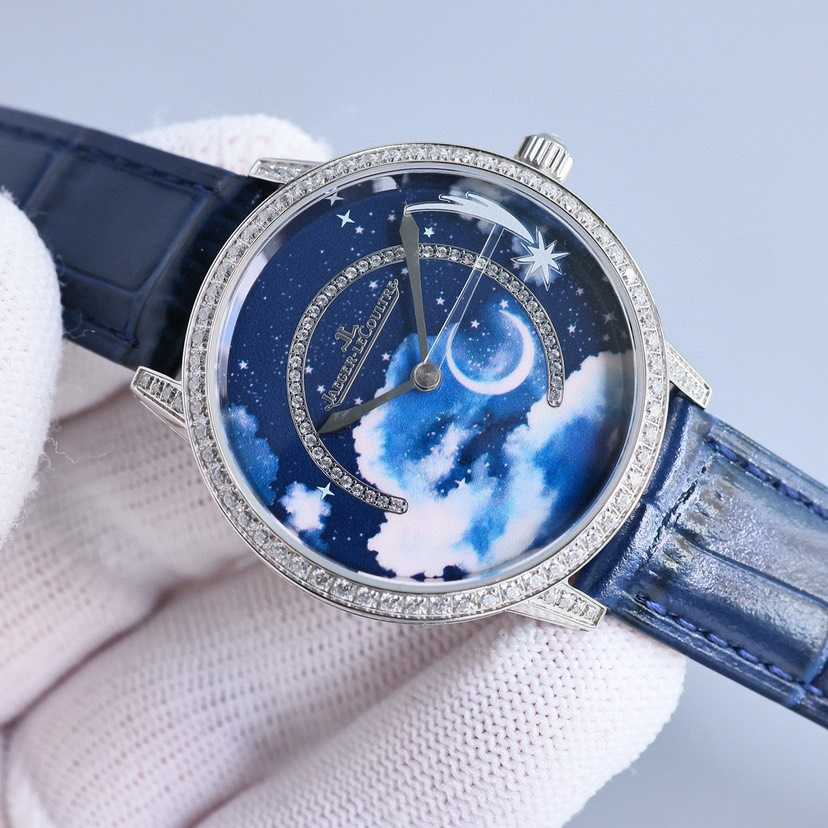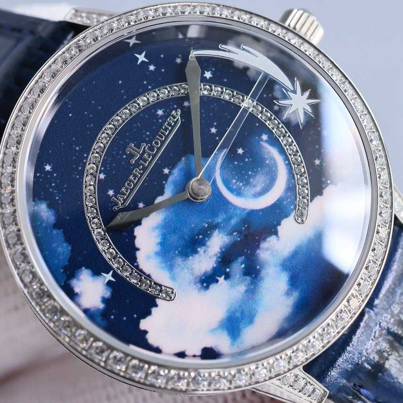 珍稀工艺款,采用先进3D技术打印繁星与弯月,再以微绘工艺在表盘上创作云朵,刻画出晴朗少云的夜空高低远近不同的层次,点睛之笔在于沿着表盘外圈划过夜空的流星,缓缓流淌,将耀眼的瞬间在腕表上再现!整表36mm搭配734一体机为流星的转动提供源源不断的动力!