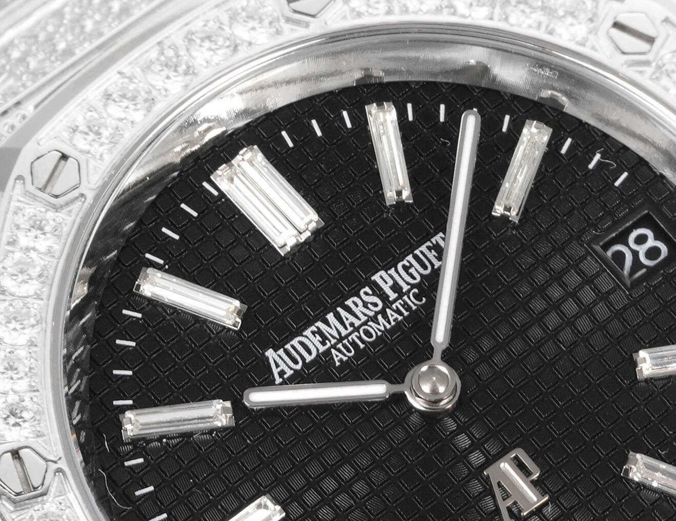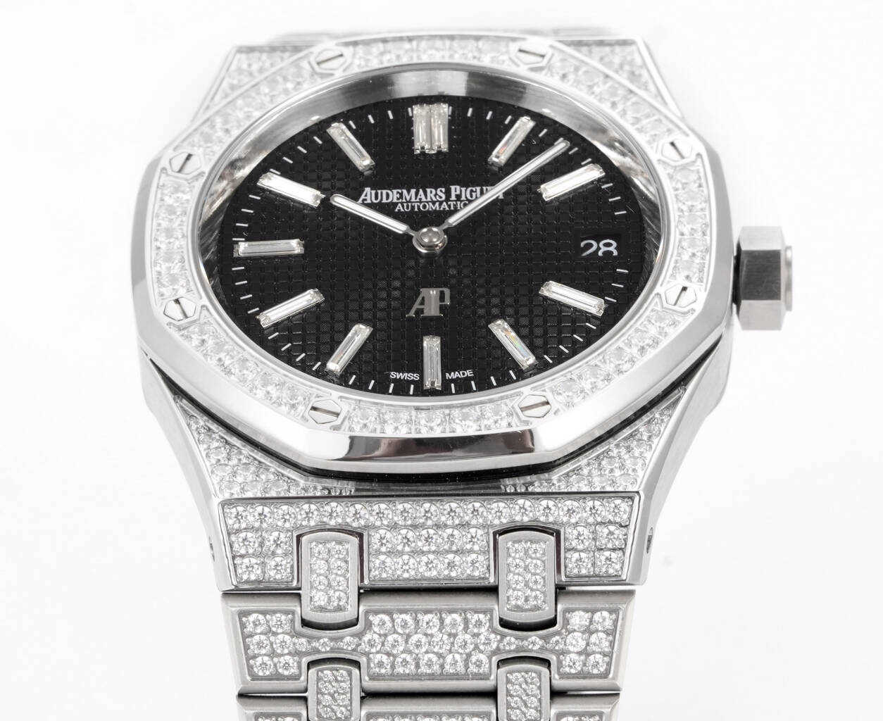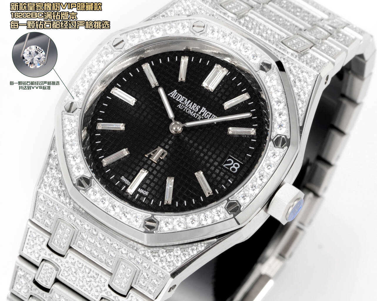 ,表壳表带都采用先电白金在镶钻,质感重量达到完美平衡。搭配高透防眩光蓝宝石玻璃镜面。自1972年由传奇制表大师杰拉尔德·吉尔多设计以来,一直是高级制表界的革命性象征,16202BC满钻版本,延续了经典的八角表圈设计同时,全表面共镶嵌顶级白钻,每一颗钻石都经过严格挑选,并达到VVS标准,璀璨程度叹为观止,超薄厚度9mm