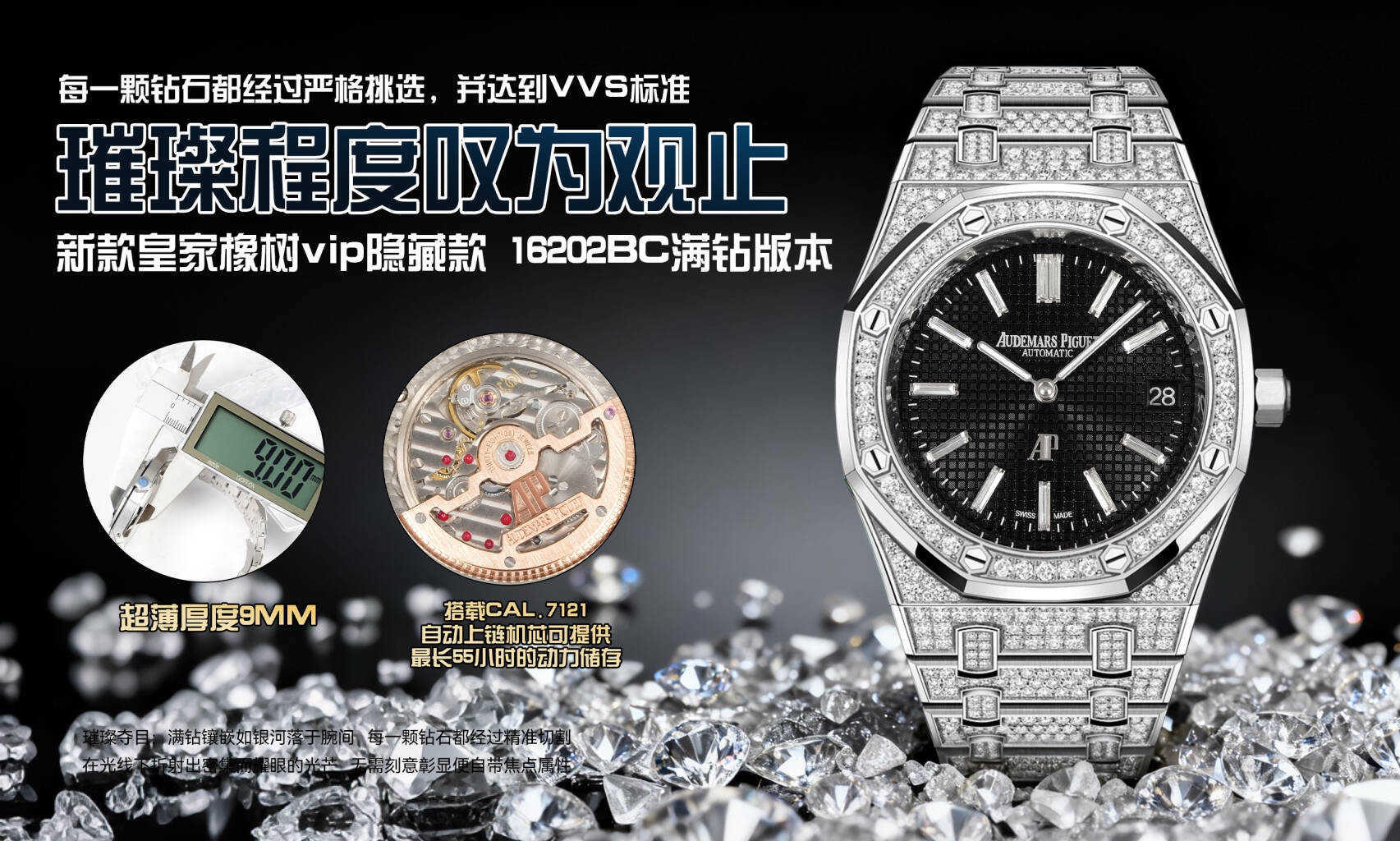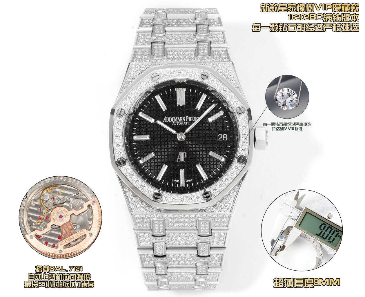 表壳尺寸39mm,搭载Cal.7121自动上链机芯可提供最长55小时的动力储存,这款满钻在阳光或灯光璀璨夺目,大方异彩。是钢壳表无法取代的。喜欢的朋友赶紧下手,数量有限。