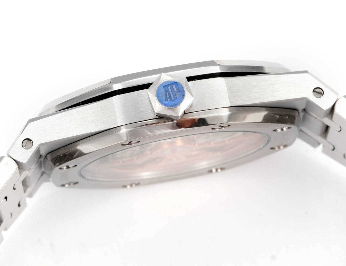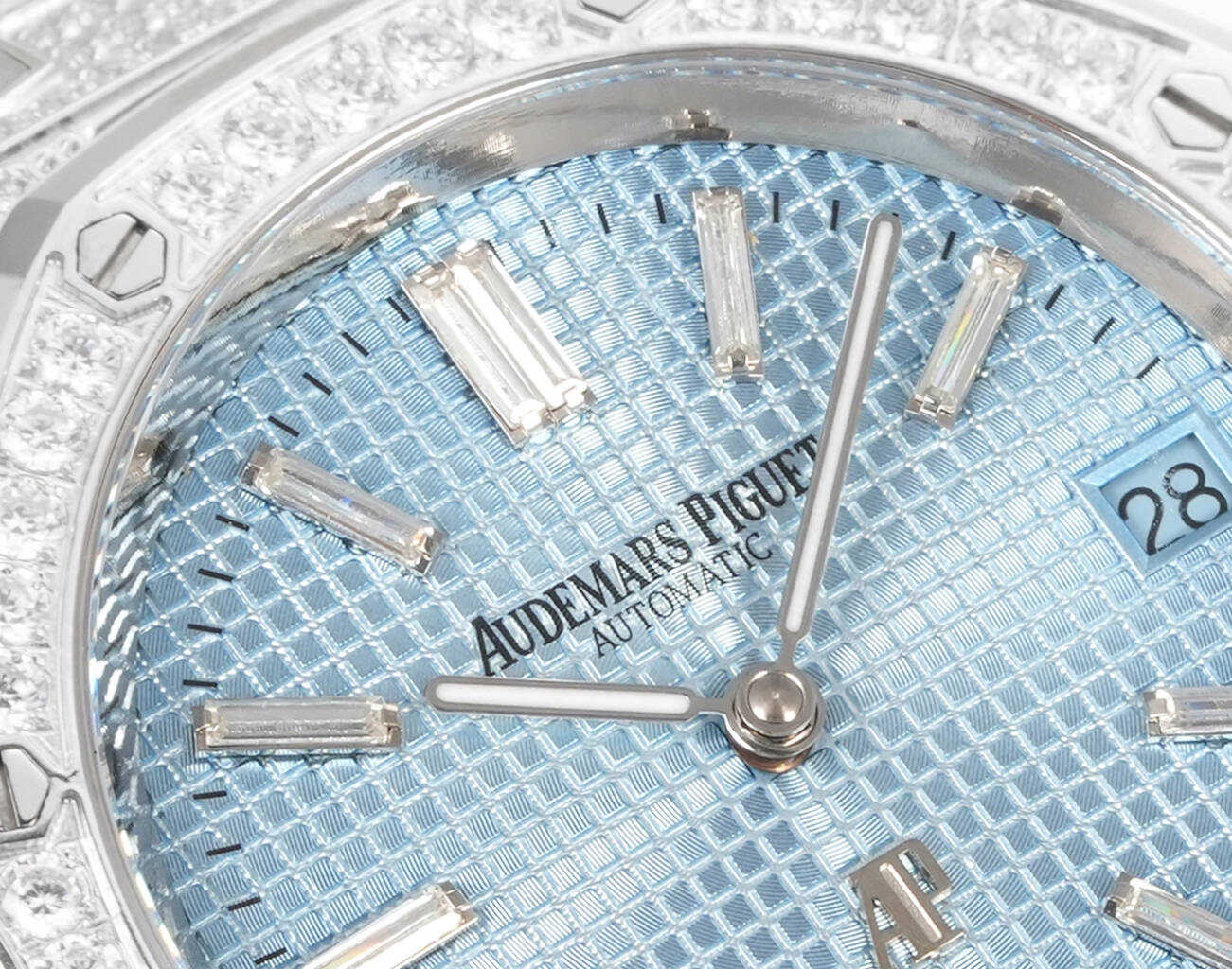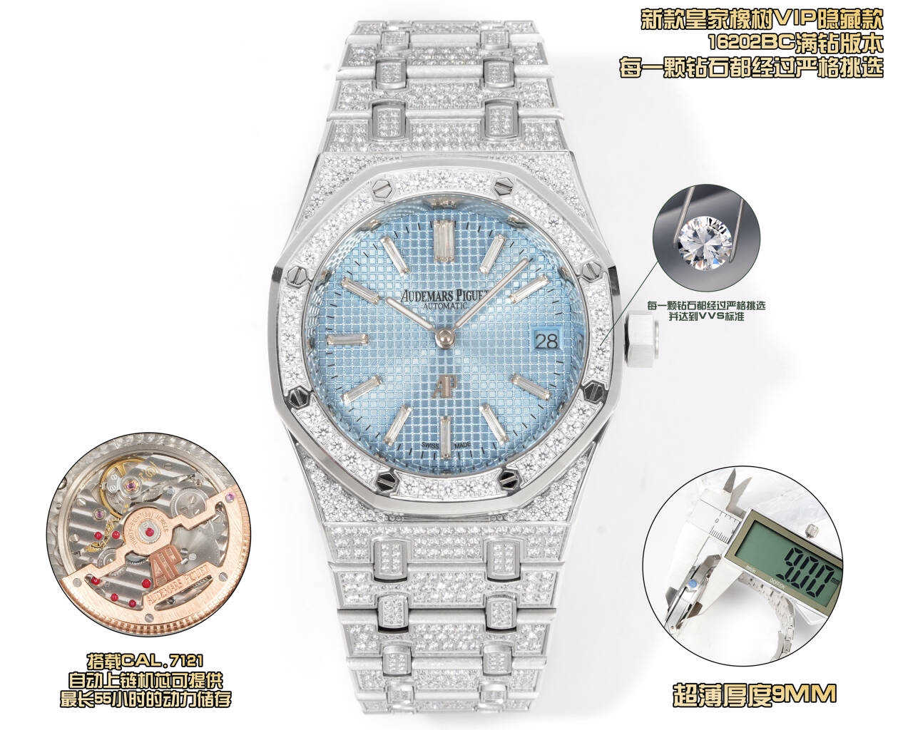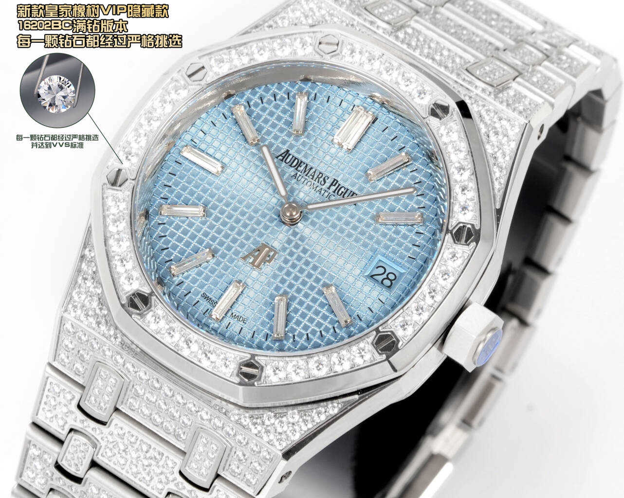 壳表带都采用先电白金在镶钻,质感重量达到完美平衡。搭配高透防眩光蓝宝石玻璃镜面。自1972年由传奇制表大师杰拉尔德·吉尔多设计以来,一直是高级制表界的革命性象征,16202BC满钻版本,延续了经典的八角表圈设计同时,全表面共镶嵌顶级白钻,每一颗钻石都经过严格挑选,并达到VVS标准,璀璨程度叹为观止,超薄厚度9mm