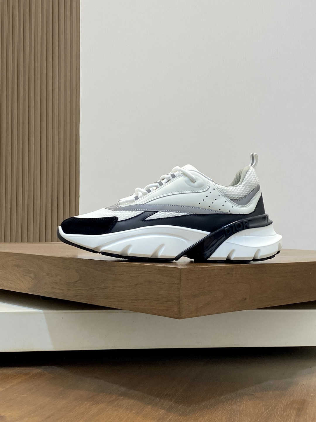 ,这款单品从复古慢跑鞋汲取灵感。采用厚实的低帮设计,以黑色牛皮革以及网眼织物拼接鞋面,搭配黑白相间的刻花橡胶鞋底。黑色网眼织物鞋舌和鞋跟支撑与黑色鞋带相得益彰,侧面带有浮雕“Di~r”标志装饰。这款运动鞋可与经典西装混搭造型,增添运动时尚气息!