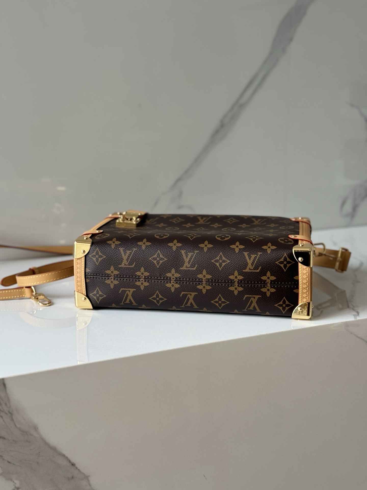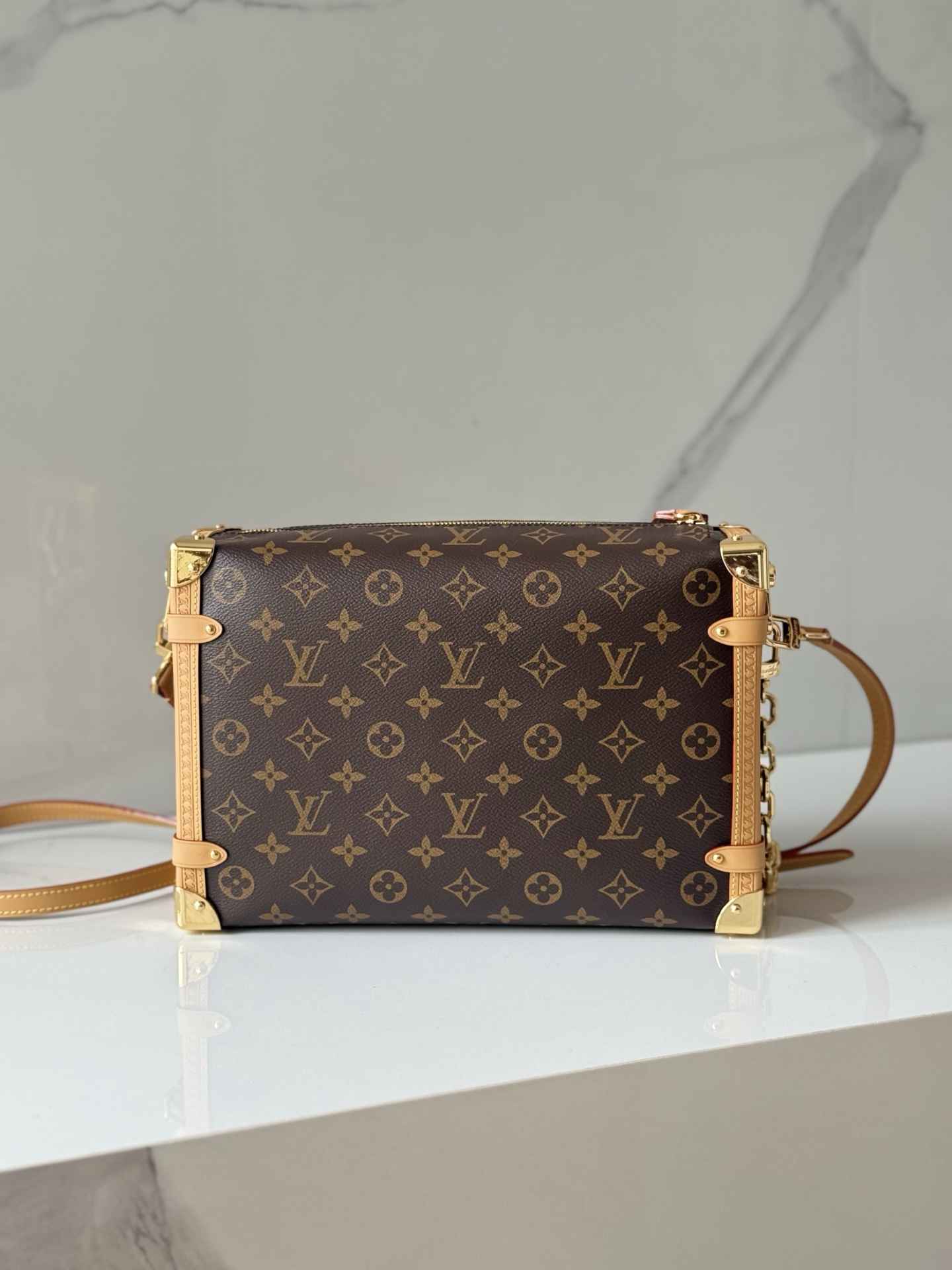 包型特点:采用Monogram帆布与撞色皮革饰边组合,搭配莹亮金属件和加长链条,顶部手柄和肩带可拆卸,支持手拎、肩背或斜挎多种背法。硬箱风格包角和S-lock锁扣强化了品牌辨识度。