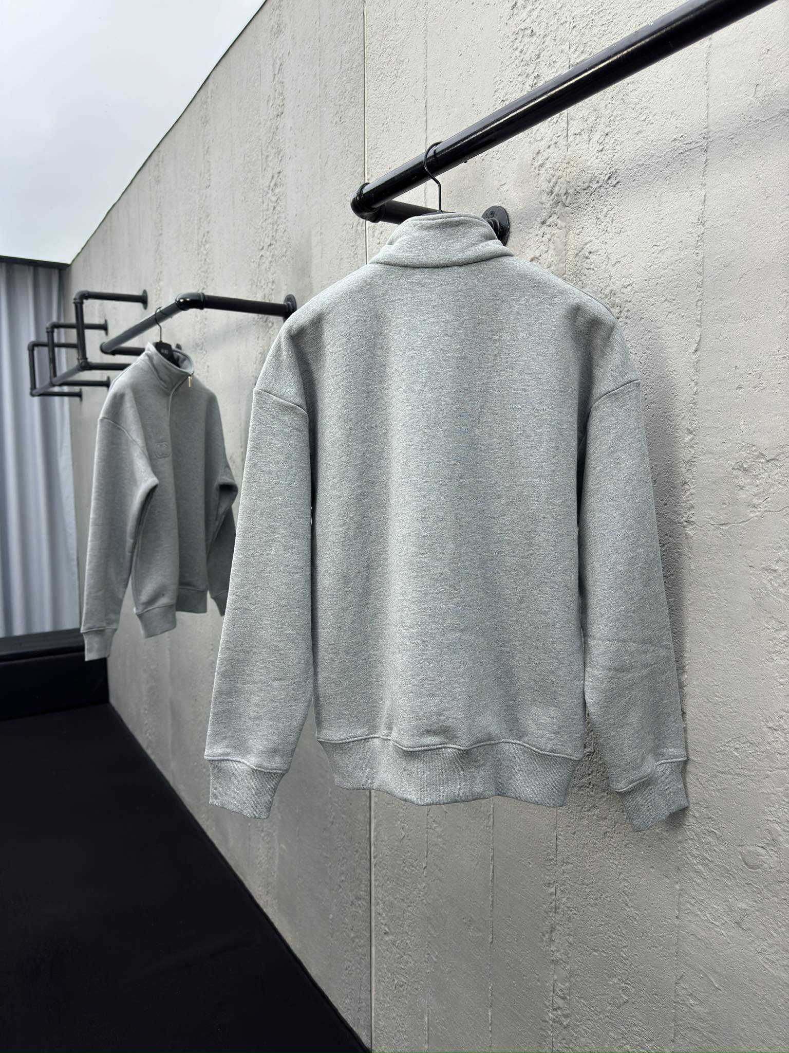 工艺说明:采用26s双股大毛圈底全棉卫衣布,克重400g,配套26s双纱大圆机2*2螺纹,面料均采用中花灰纱线定织订染,底面抓毛剪绒洗水,做成天鹅绒底,根据Y样开模版,花样机走两圈线锁住花型,前幅LOGO刺绣采用凸版压花工艺,侧边平车拼撞色挤边条,前中采用3#胶牙闭尾拉链,