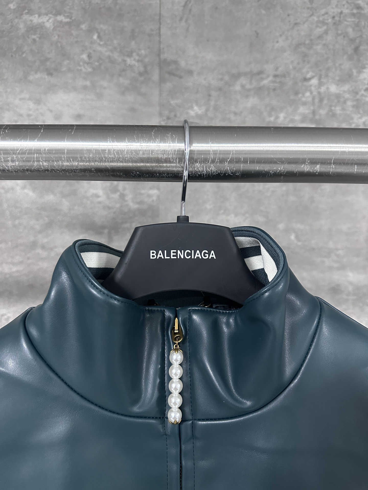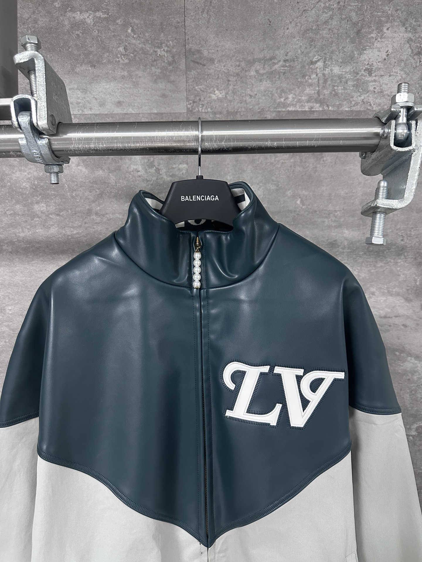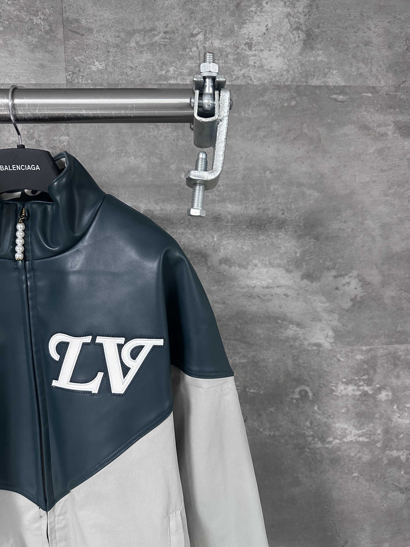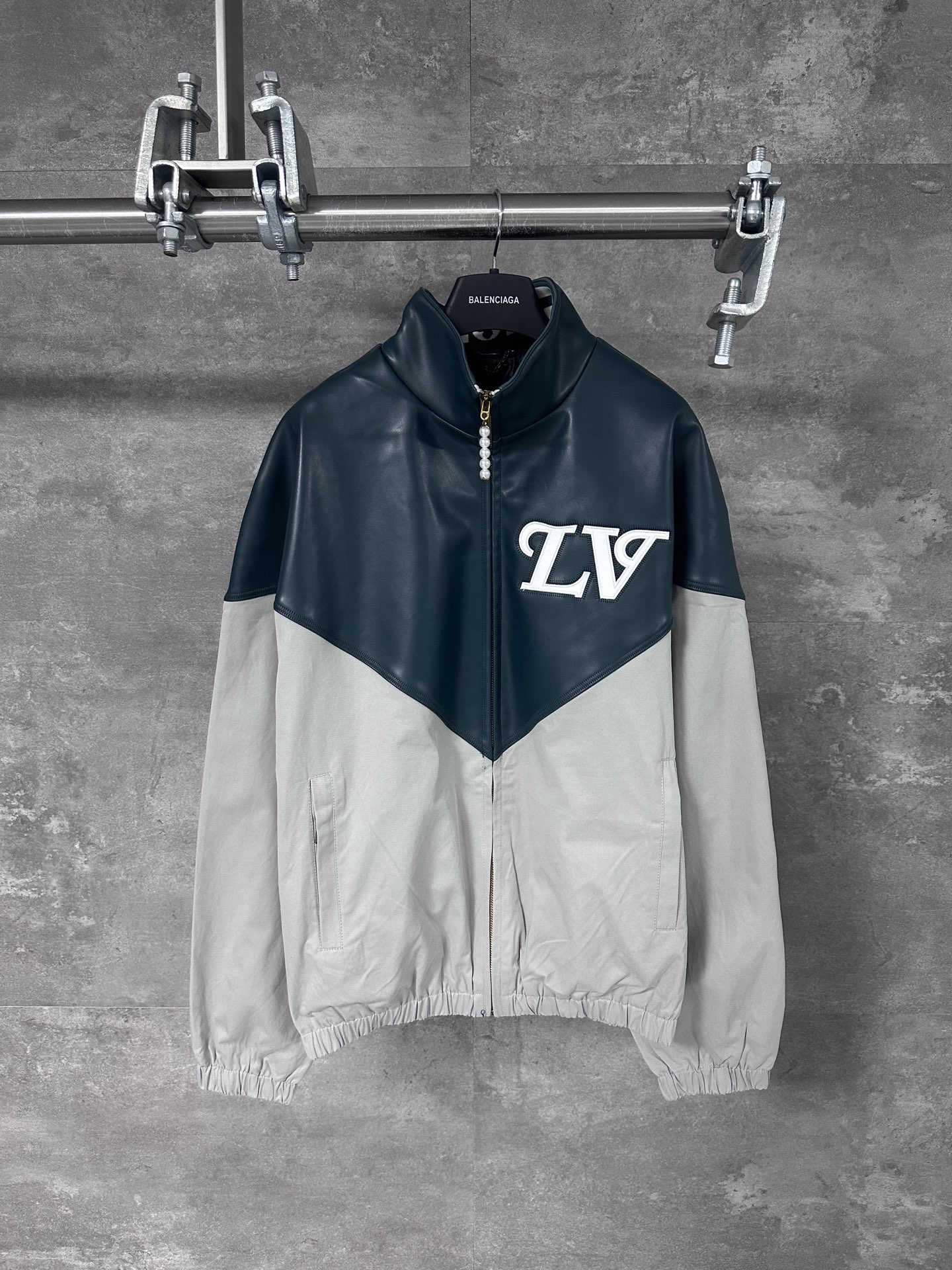 本款延续新季美式学院风主题的灵感笔触,以亮面皮革呈现上半部分的尖角育克和 LV 嵌花标识,与下半部分的素雅锦纶混纺形成鲜明反差。弹力下摆和袖口彰显功能考量,衣领跃现醒目标识,珠饰拉链头再添华美一笔。