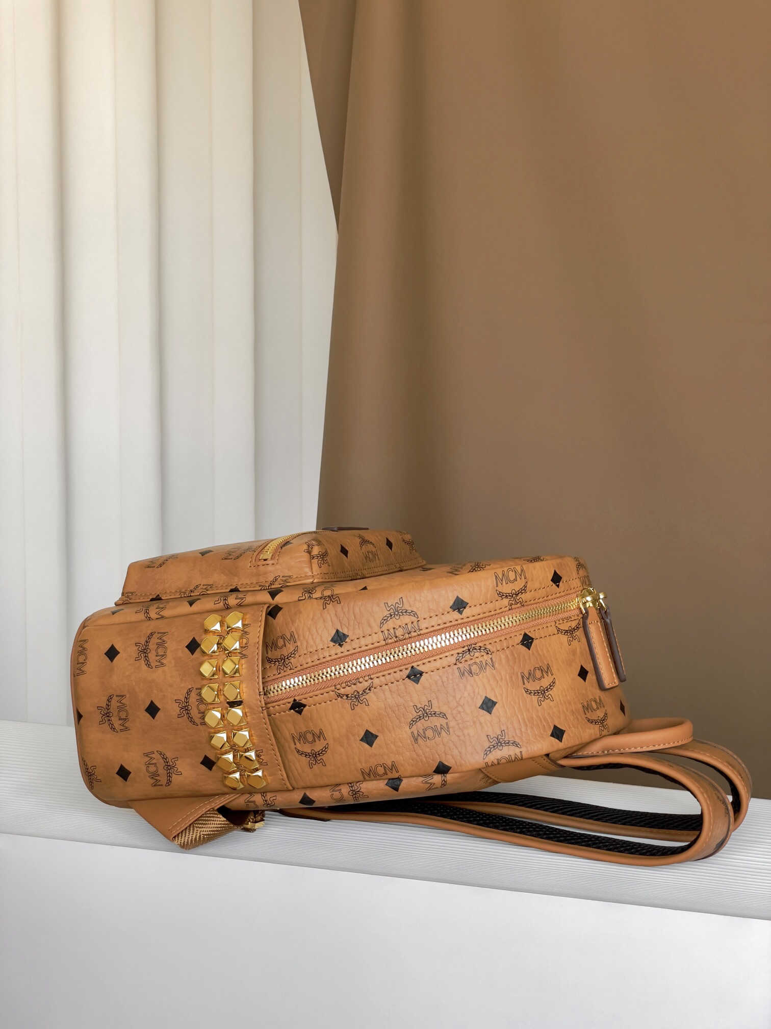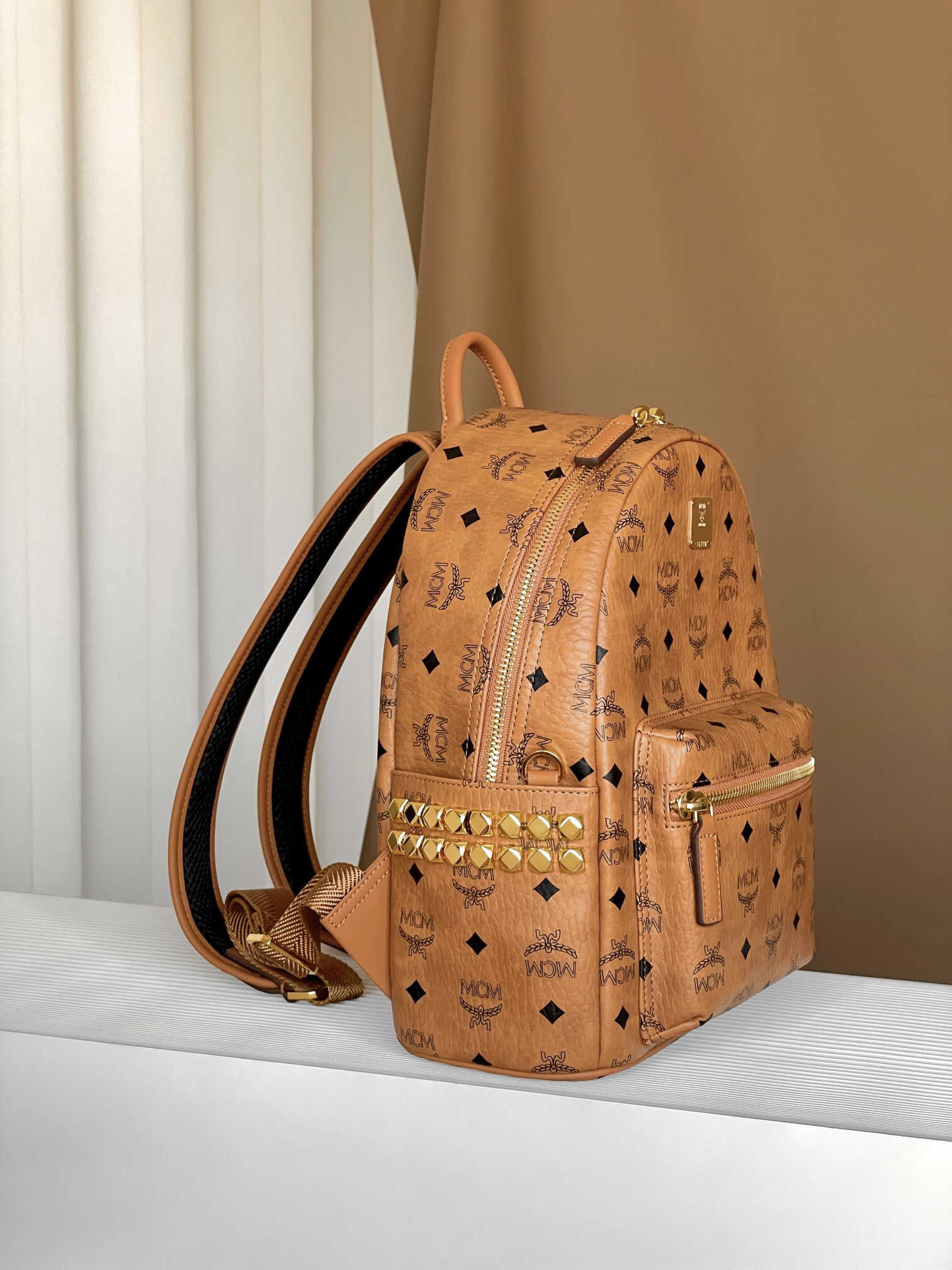 # 本季的小号Stark双肩是MCM的重新演绎 单品采用我们标志性的Visetos涂层帆布制成 采用奢华的人造皮革衬里 结构化设计拥有宽敞的内部空间和金字塔形铆钉饰边 为您的造型增添前卫风格。
