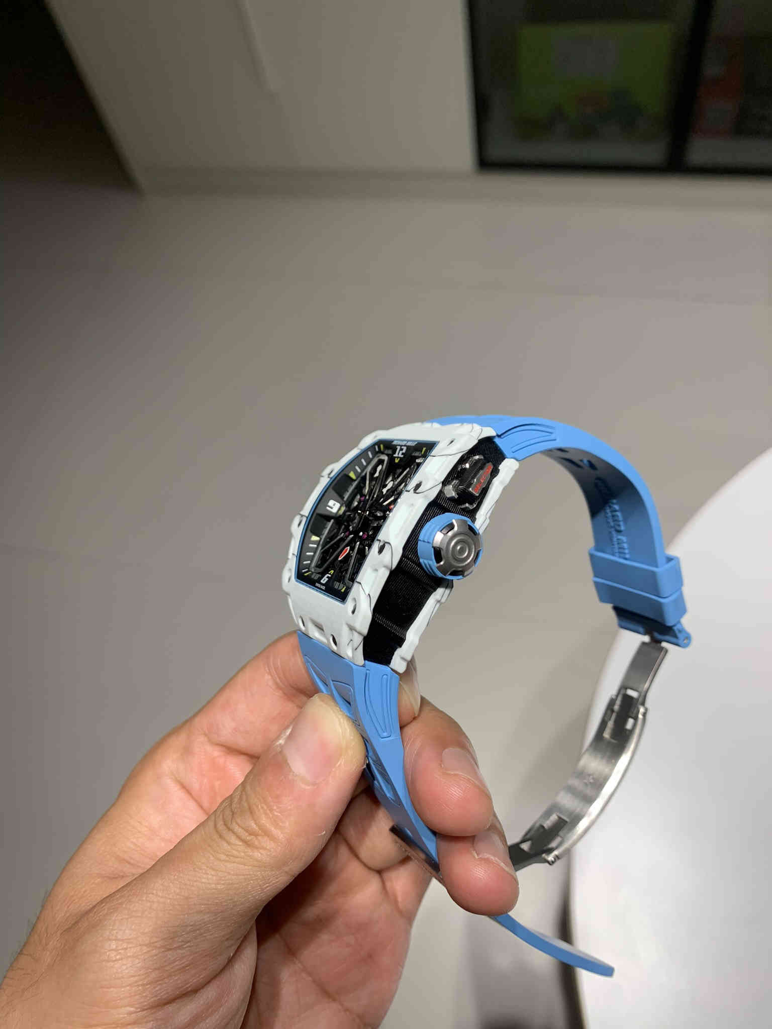 理查徳 米勒 Richard Mille RM035-03碳纤维系列 此版表壳和底盖釆用高密度进口NTPT@碳纤维材料 碳纤维表壳表底和钛内胆两侧釆用同步CNC加工!使之壳上下与左右二侧毫无缝隙,马来西亚进口橡胶表带尼龙表带,使之呈现出超韧性及柔软的感觉,依原版原理采用钛金属材料作为内胆及釆用最前沿的电火花精切缕空技术!搭载原装进口机械机芯 蓝宝石水晶玻璃 极具个性与夸张的表壳表盘设计只为遇见个性独特的你