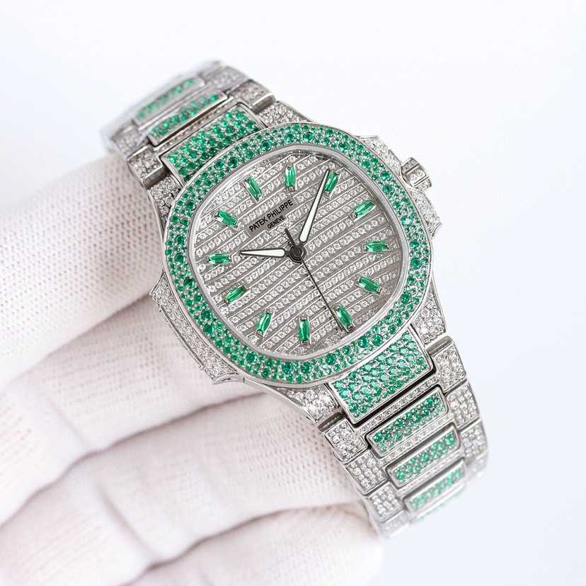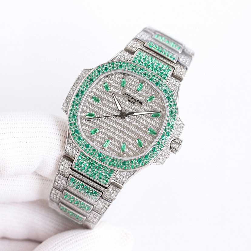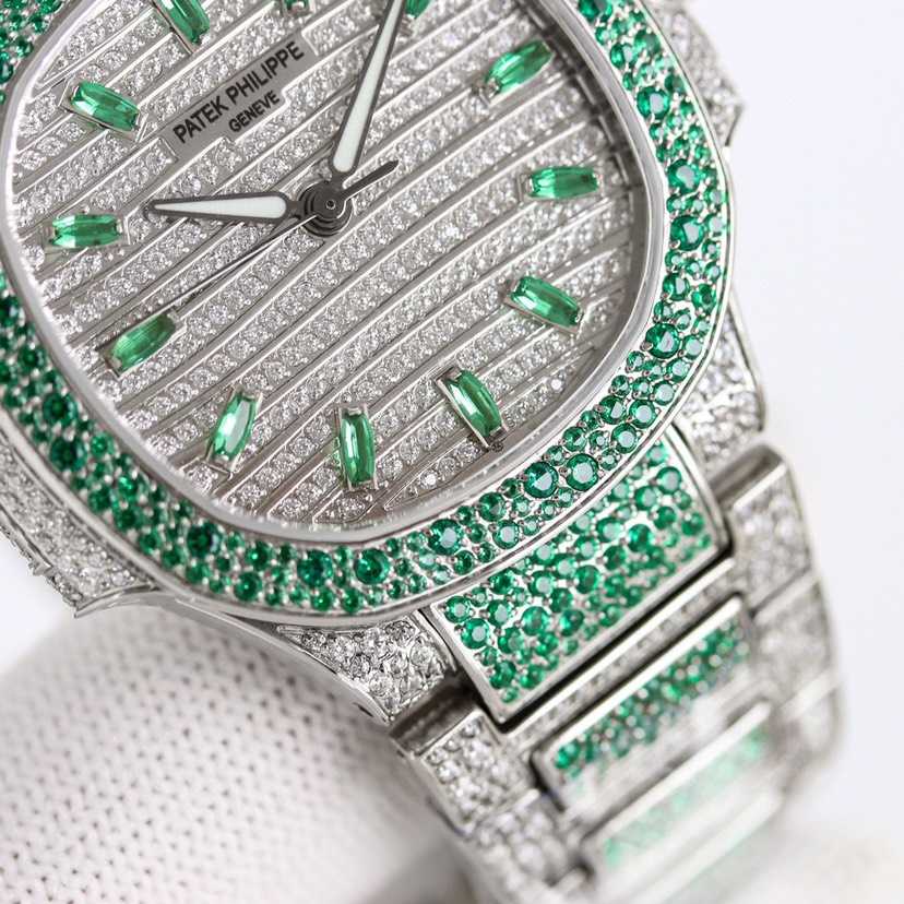 女士鹦鹉螺 满钻限量款 少量到货,三款7118满砖腕表分别镶嵌红宝石、蓝宝石、祖母绿三种不同色彩的宝石镶嵌,限量供应(全身采用八心八箭天然奥宝水钻)