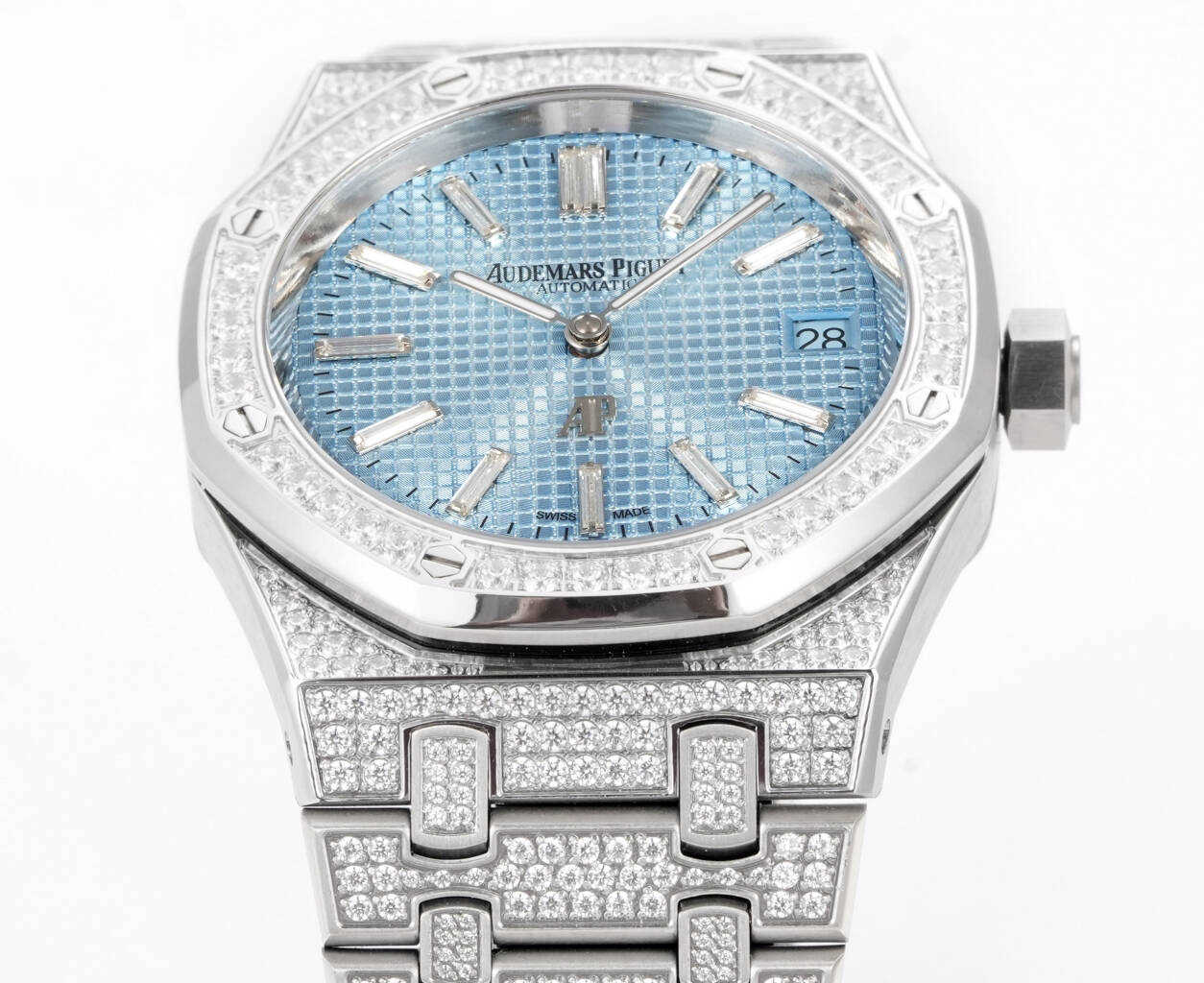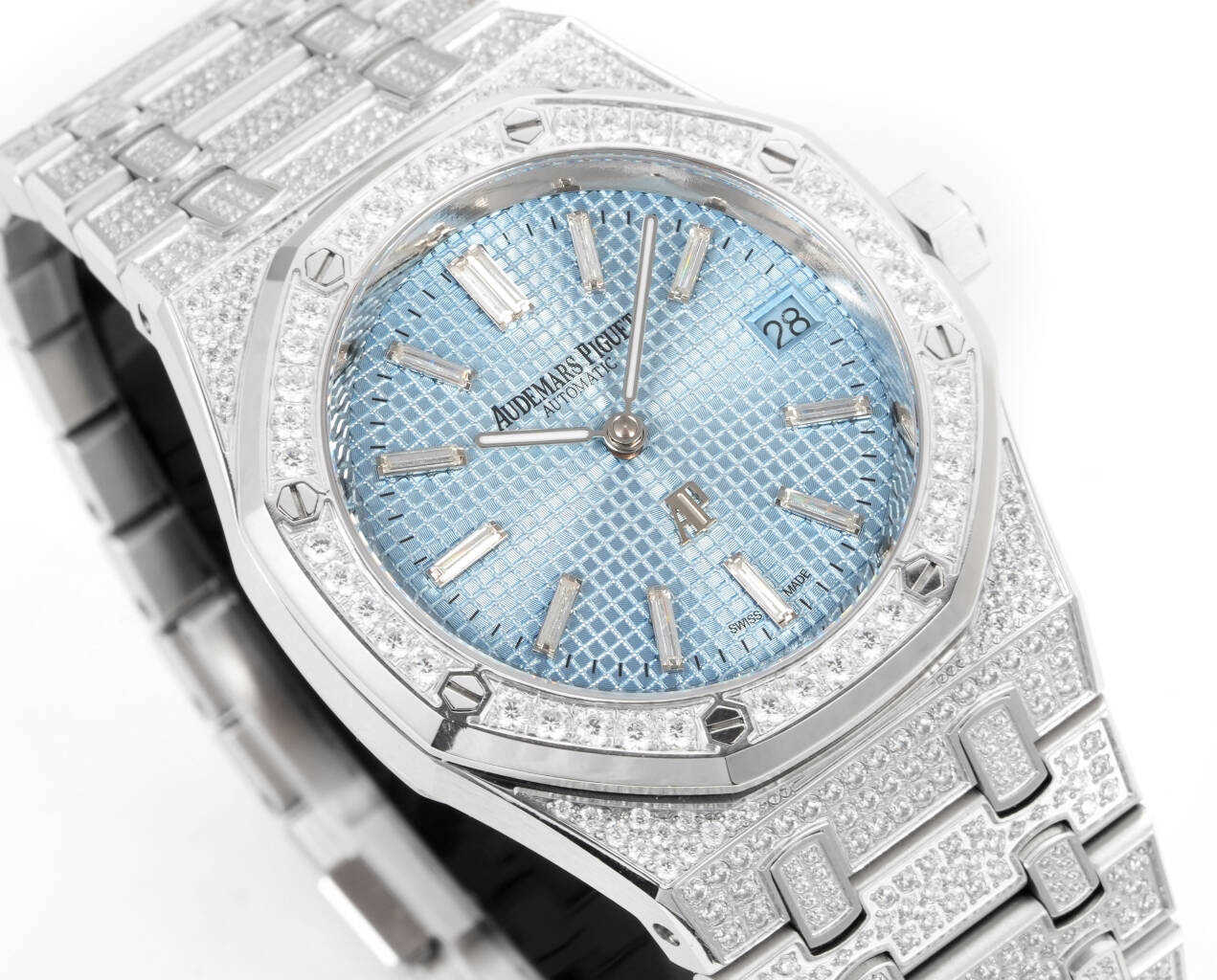 壳表带都采用先电白金在镶钻,质感重量达到完美平衡。搭配高透防眩光蓝宝石玻璃镜面。自1972年由传奇制表大师杰拉尔德·吉尔多设计以来,一直是高级制表界的革命性象征,16202BC满钻版本,延续了经典的八角表圈设计同时,全表面共镶嵌顶级白钻,每一颗钻石都经过严格挑选,并达到VVS标准,璀璨程度叹为观止,超薄厚度9mm