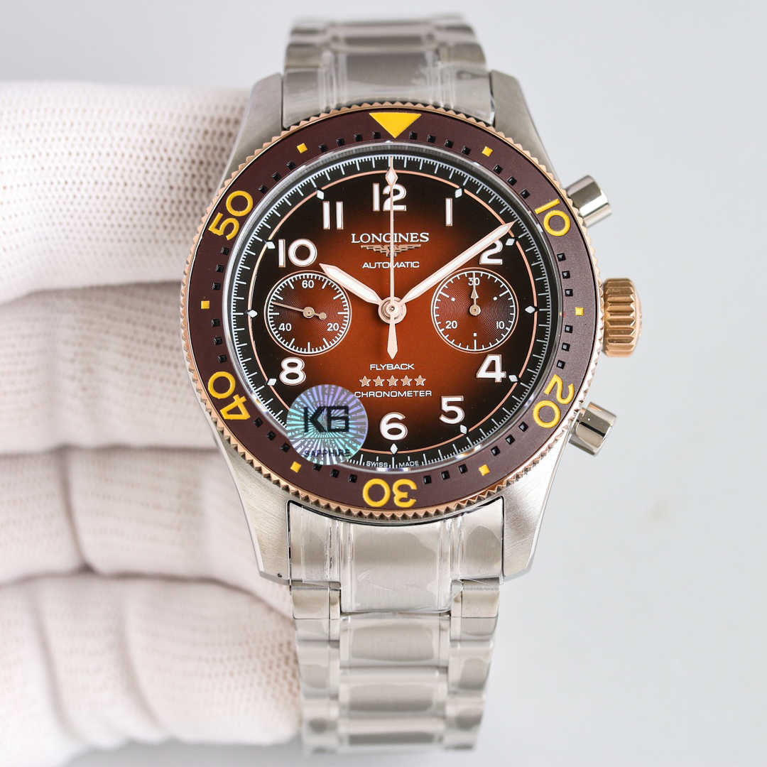 表盘有绿色,咖啡色、黑色和蓝色,3点位为计时盘、9点位为小秒盘,中央大秒为计时大秒针。表盘上6点位标注了“FIyback”飞返功能,是非常便捷的计时码表。