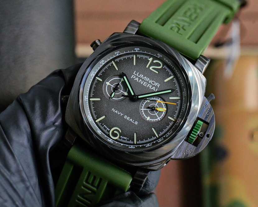搭配原装进口2555全自动机械机芯⌚️以沛纳海全新材质BMG-TECH™材质打造而成,拥有超高的强韧度和抗划伤性能。每一款腕表都是独一无二。圆形刻度和镂空指针极具辨识度,并且覆以Super-LumiNova®超级夜光涂层,确保在黑暗的环境下也能够清晰地读取时间信息。