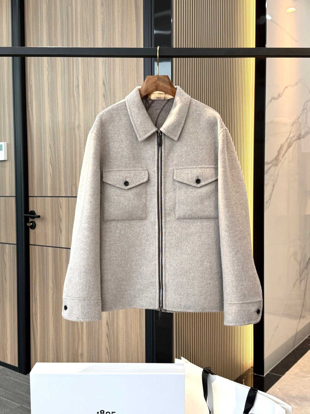 主体采用70%高支羊毛 + 30%顶级羊绒呢料,手感柔软细腻,兼具羊毛的挺括与羊绒的顺滑。双面精纺羊绒毛工艺 两面皆可见的高级质感,穿着轻盈又保暖。 表层低调的米灰色视觉效果干净简约,质地紧密却不厚重,彰显秋冬高端面料的舒适与奢华