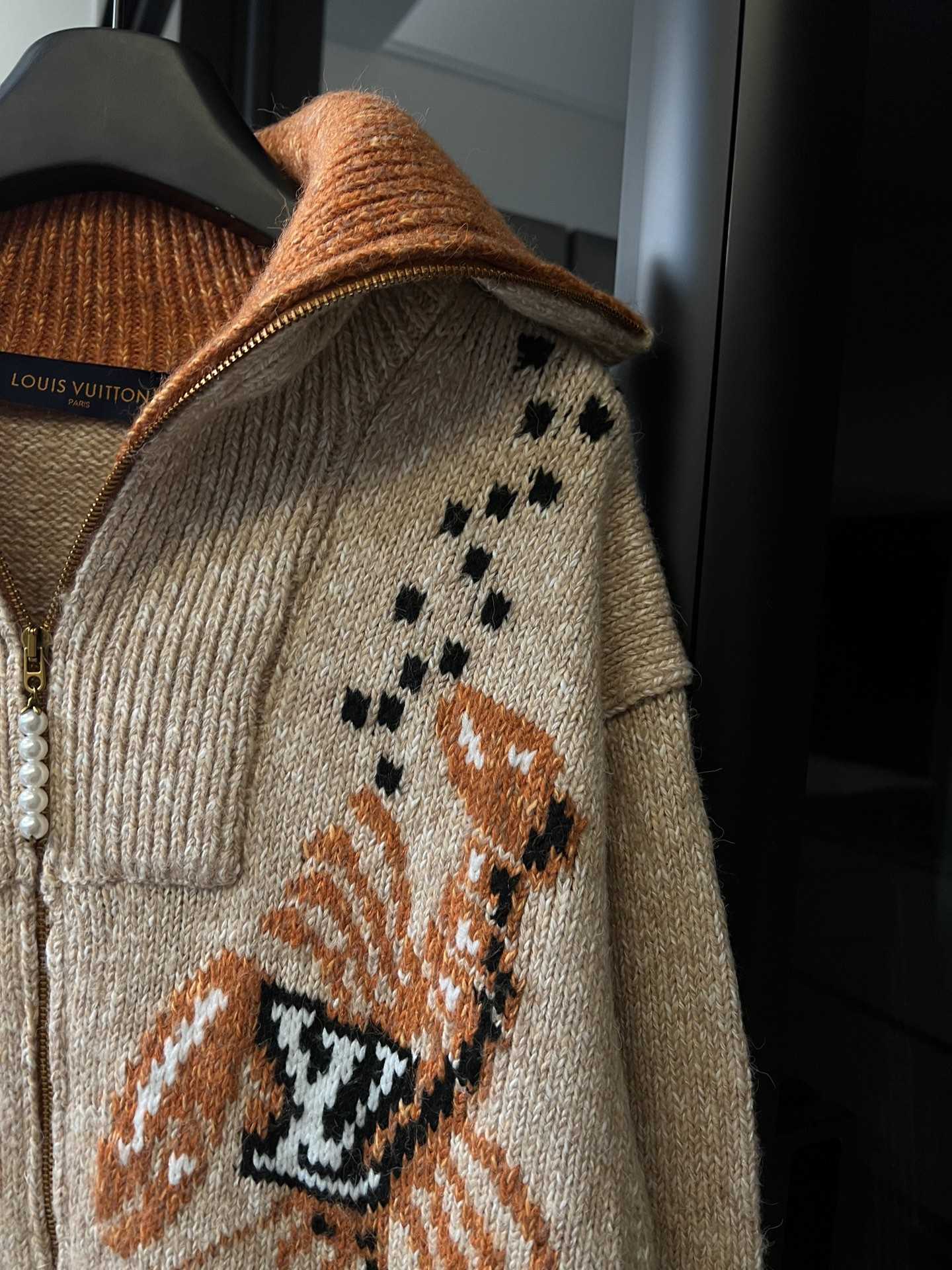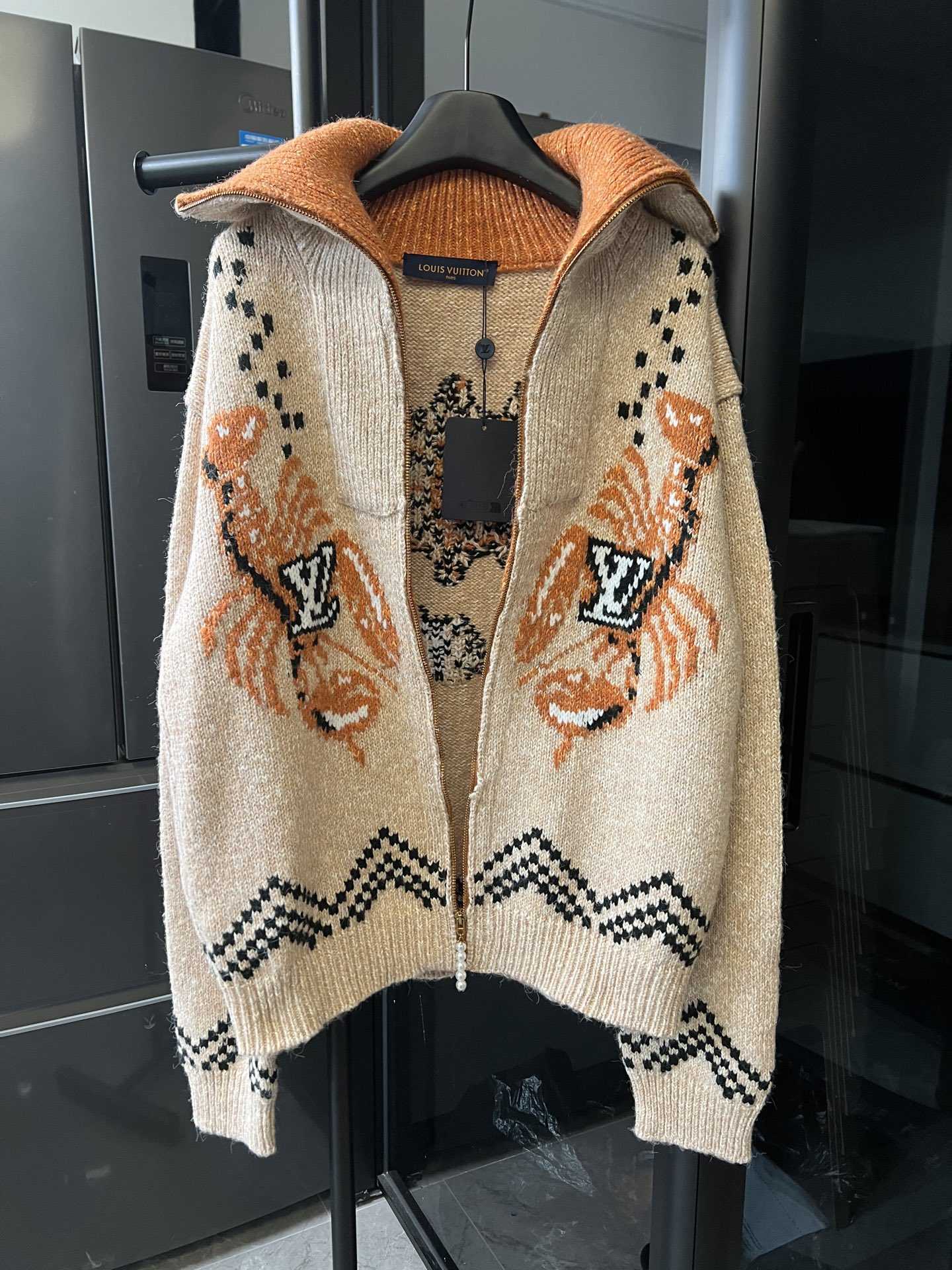本款针织束腰出自 Pharrell Williams 和 Nigo 携手合作的2025秋冬系列,以灵动嵌花图案致意后者的日本传承。正面刺绣LV 标识龙虾,后部饰以樱花和日式手写体标识,珠饰拉链头为舒暖设计增添雅致气息,男女同款。