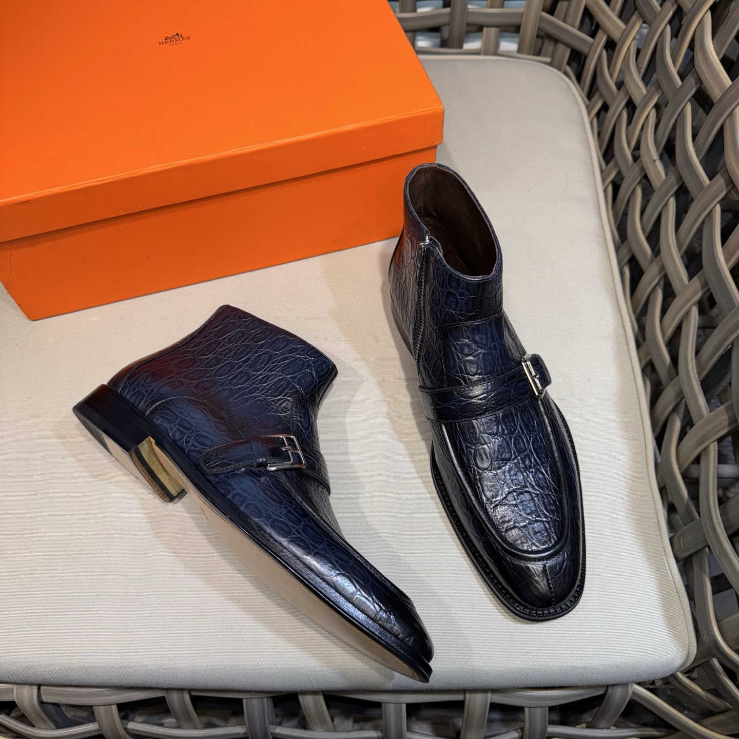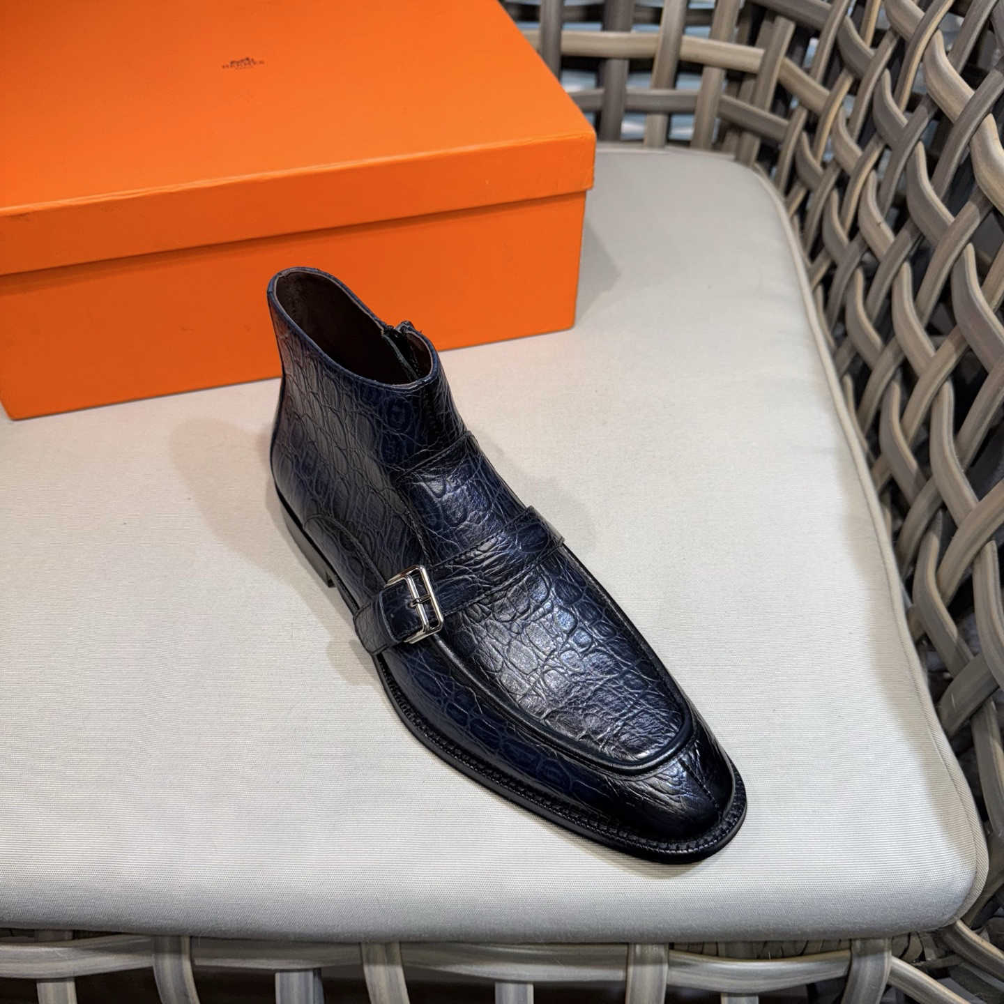 |精选进口鳄鱼纹压花牛皮|每一寸纹理都了鳄鱼皮的天然肌理|既有野性的视觉冲击,又兼具真皮的柔软质感与透气性|标志性的金属扣饰源自爱马-仕经典马具元素|银色金属的冷冽光泽与皮革的暖调形成鲜明对比,成为鞋款的视觉焦点|侧边拉链设计兼顾了穿脱的便捷性与鞋面的完整性