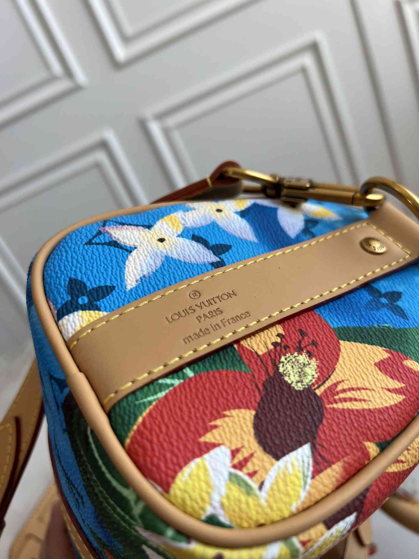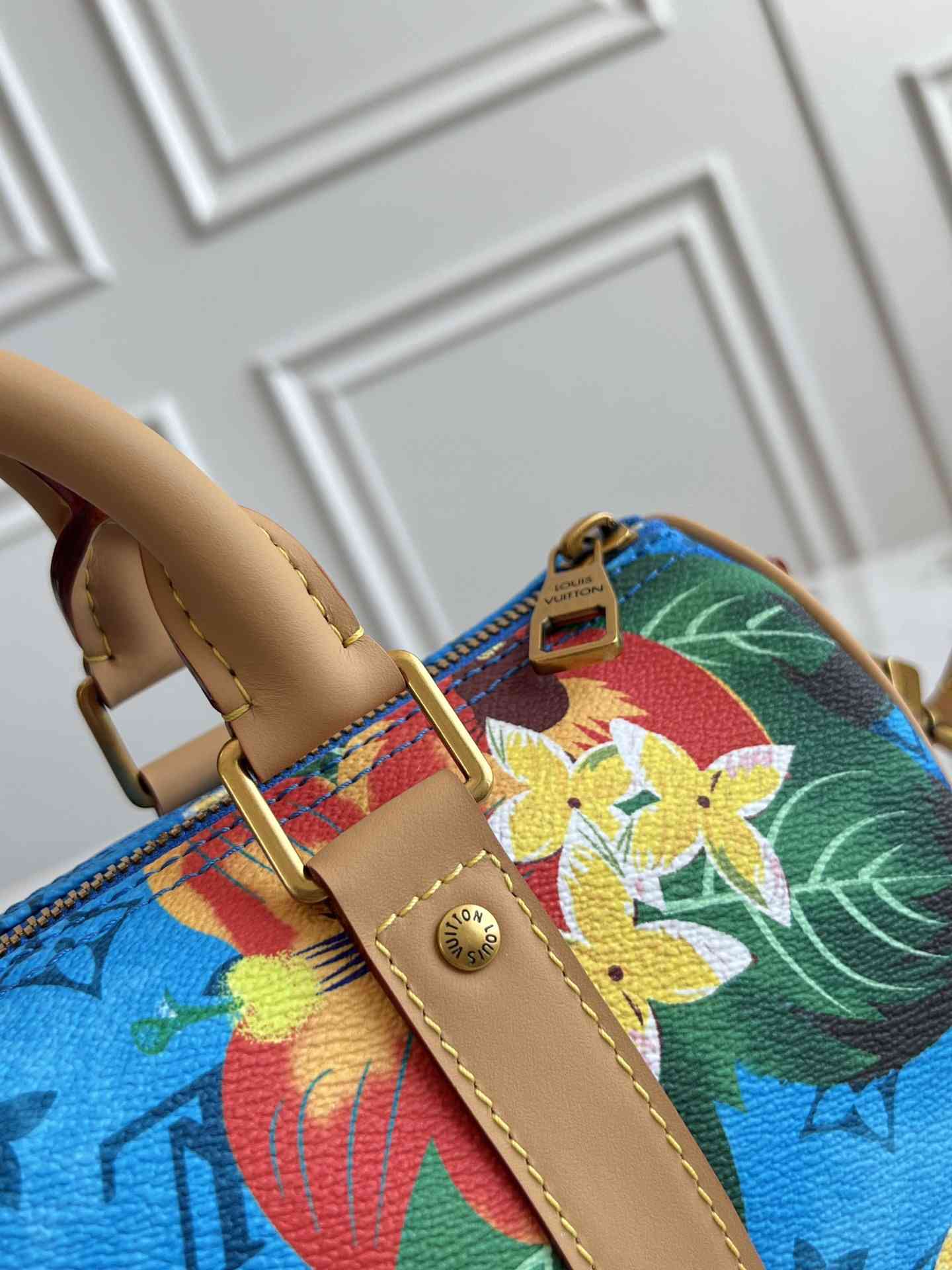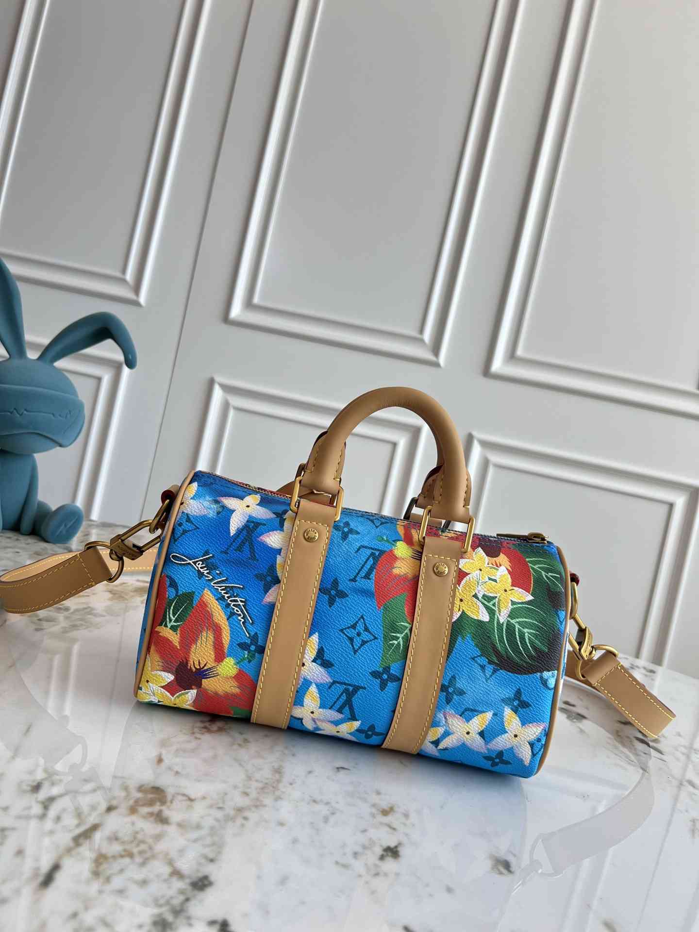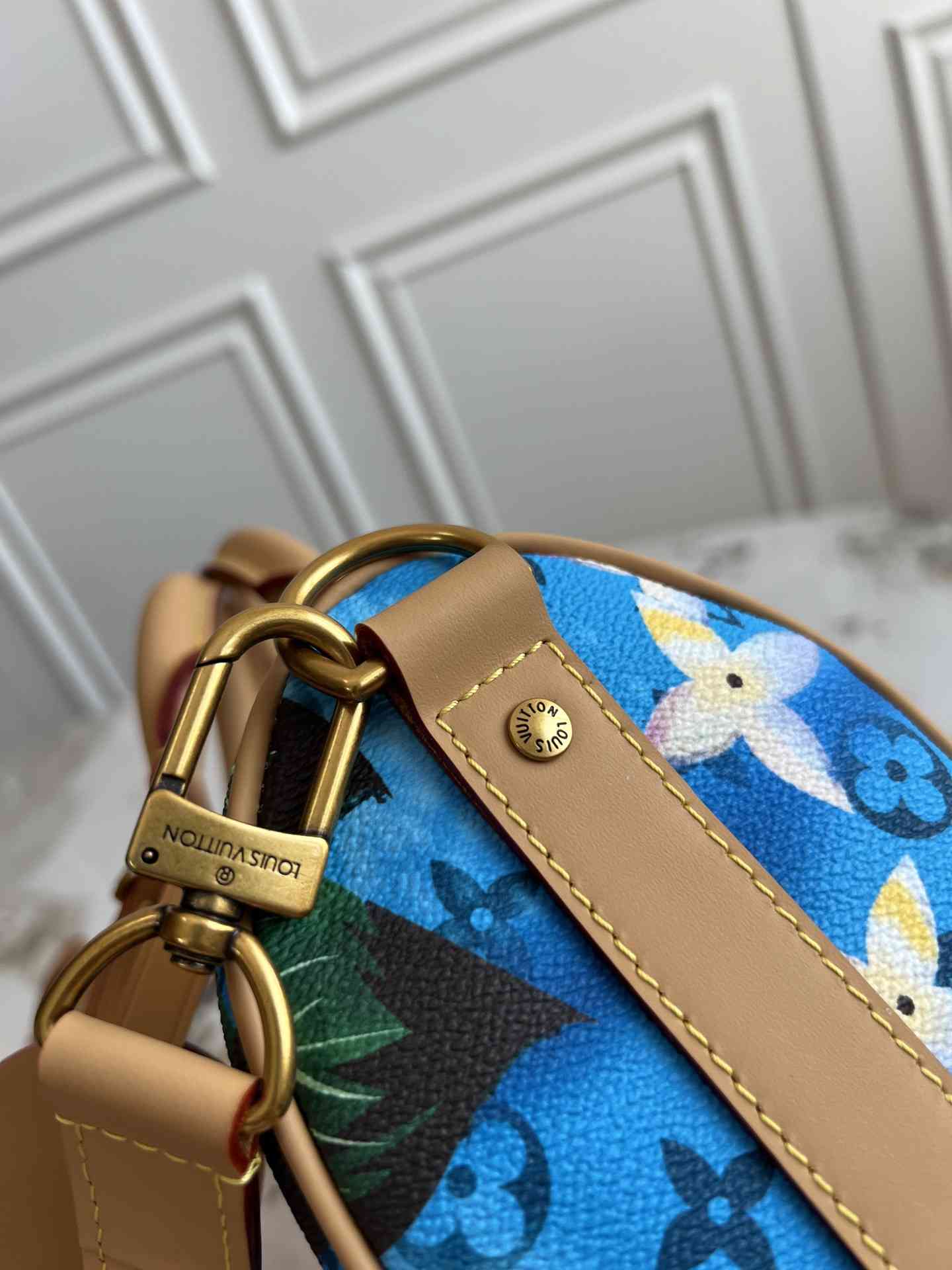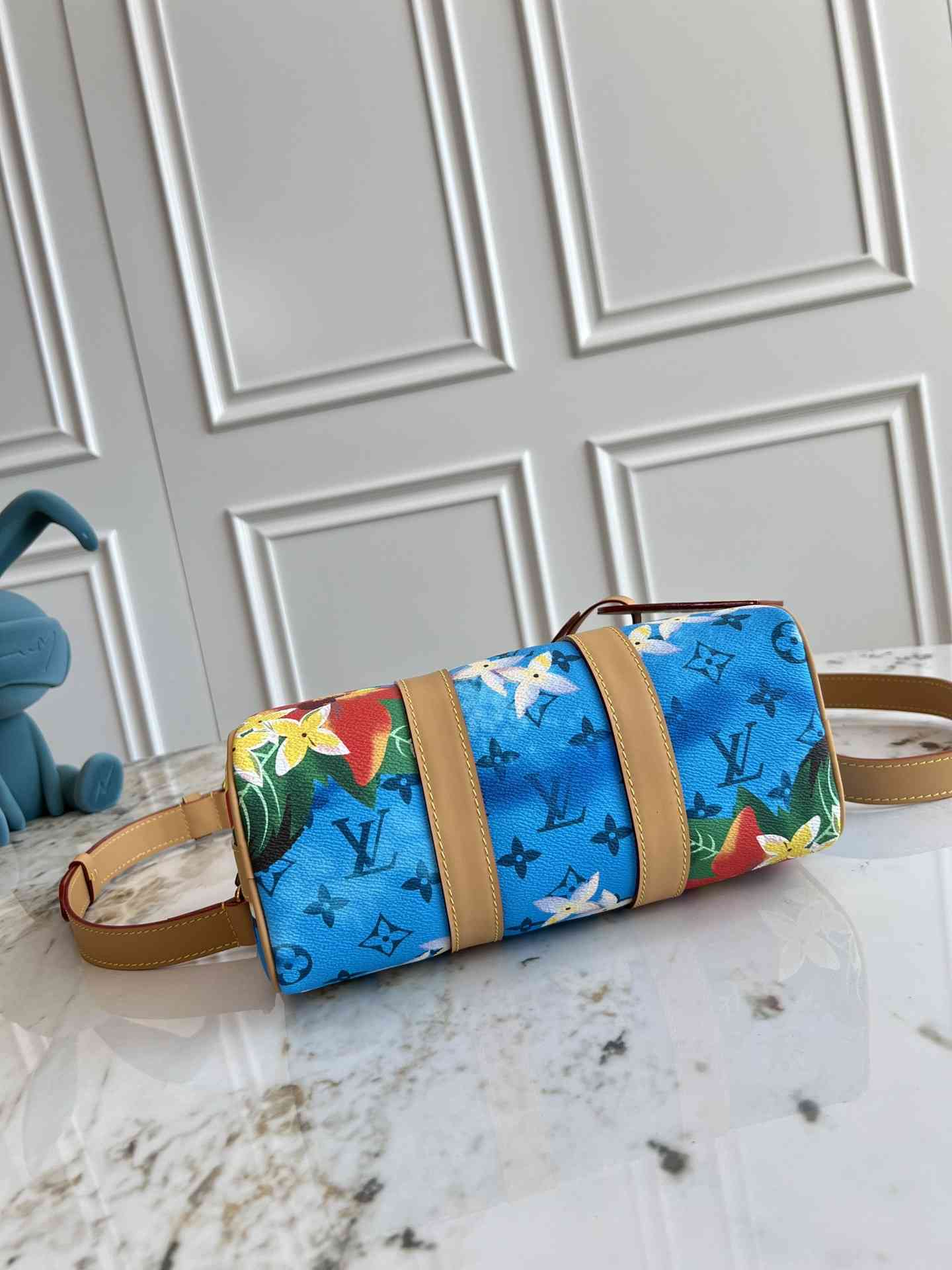 M24999 本款 24999Keepall Bandoulière 25 手袋浓缩经典 Keepall 旅行袋设计,以 Pharrell Williams 创作的 Monogram Surfin’ 帆布演绎都市型格。繁复图案融合缤纷夏日元素,洋溢热带风情和复古格调,可拆卸肩带和辊压皮革手柄实现多种背携方式。尺寸25 x 15 x 11 厘米40
