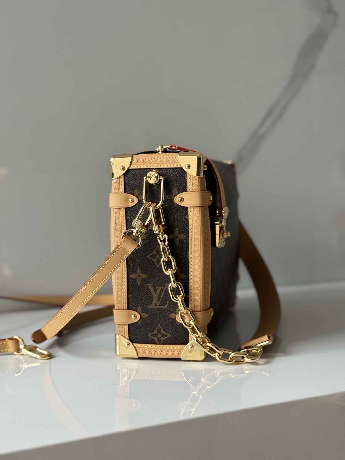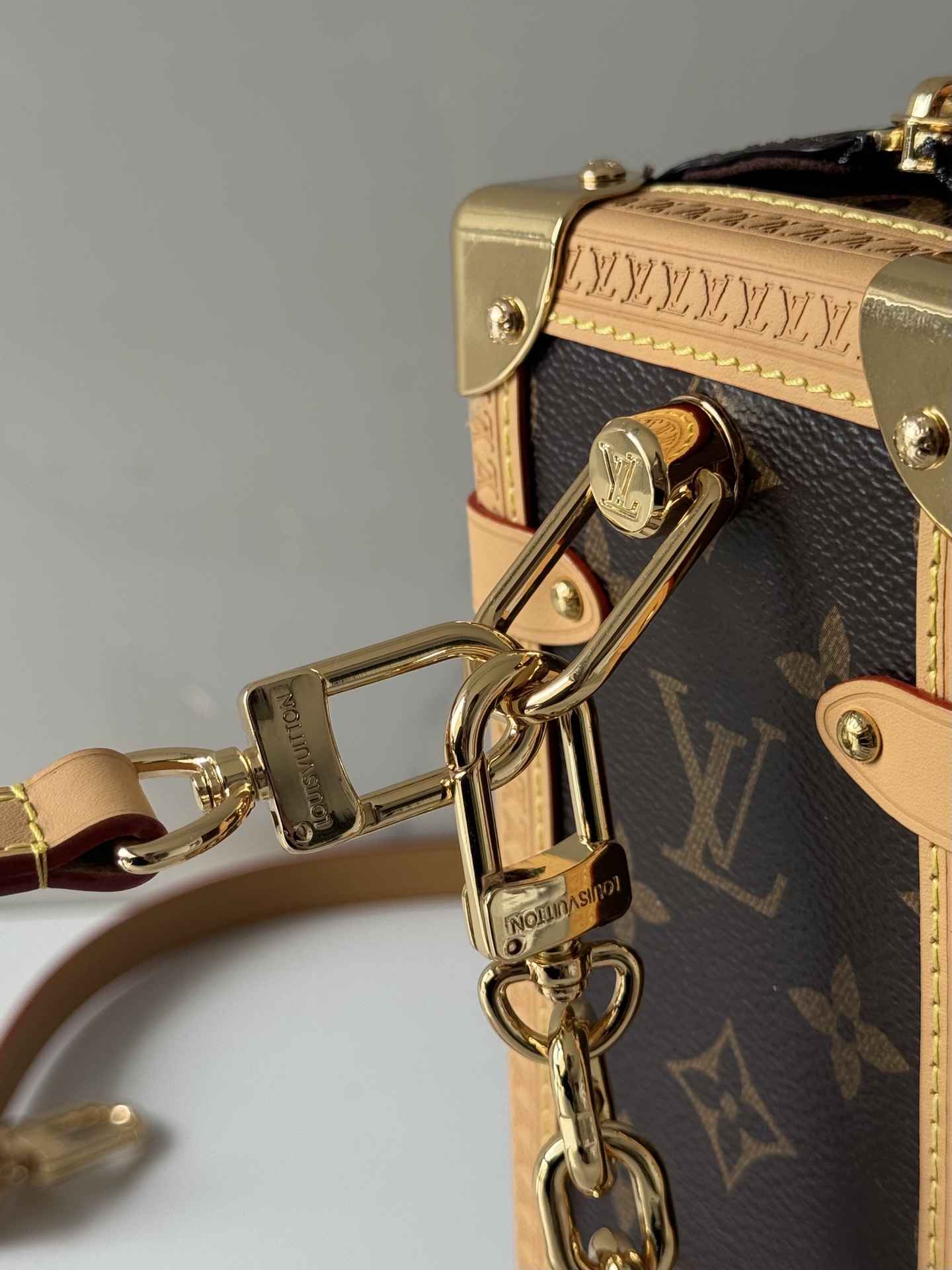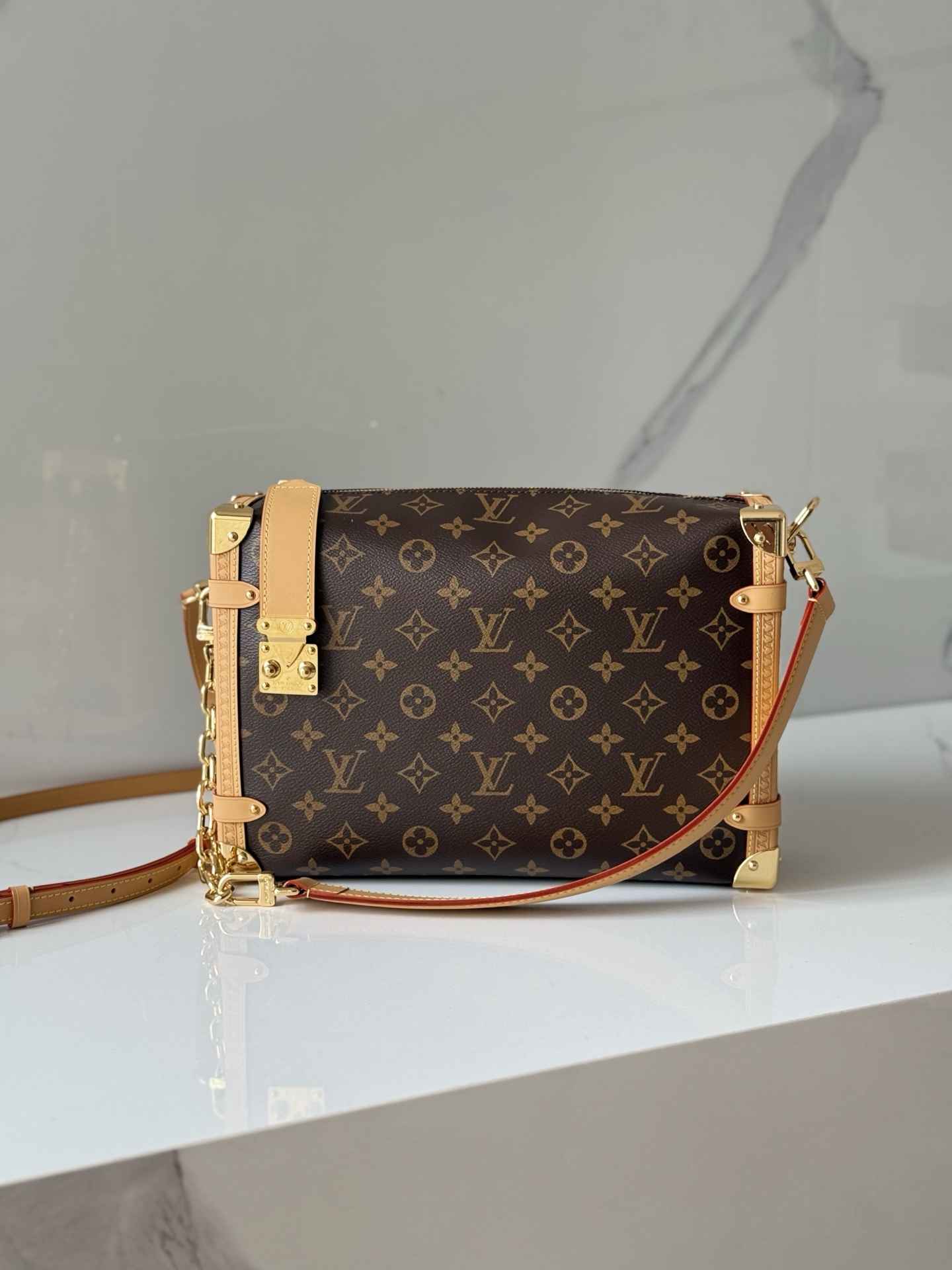 包型特点:采用Monogram帆布与撞色皮革饰边组合,搭配莹亮金属件和加长链条,顶部手柄和肩带可拆卸,支持手拎、肩背或斜挎多种背法。硬箱风格包角和S-lock锁扣强化了品牌辨识度。