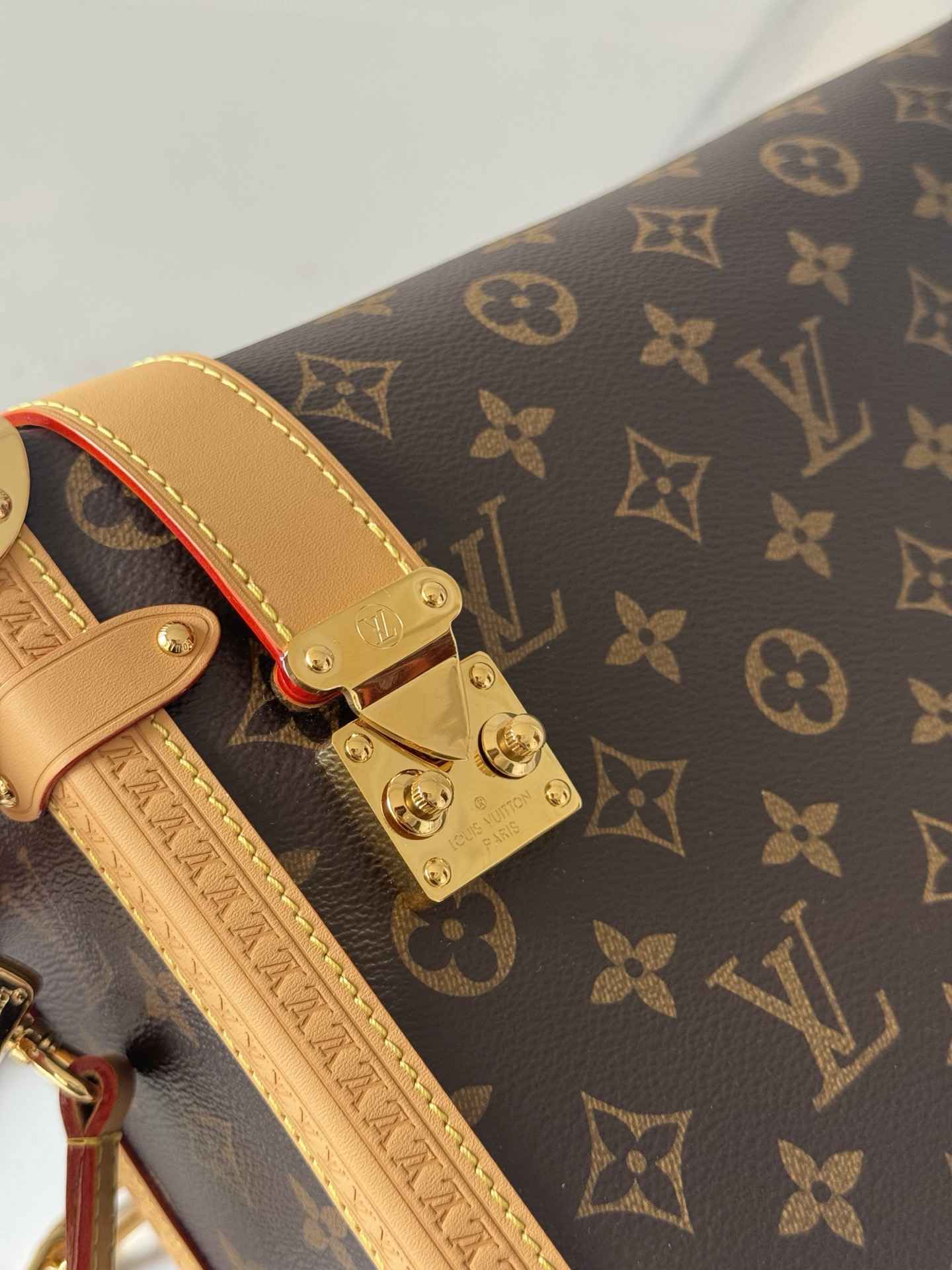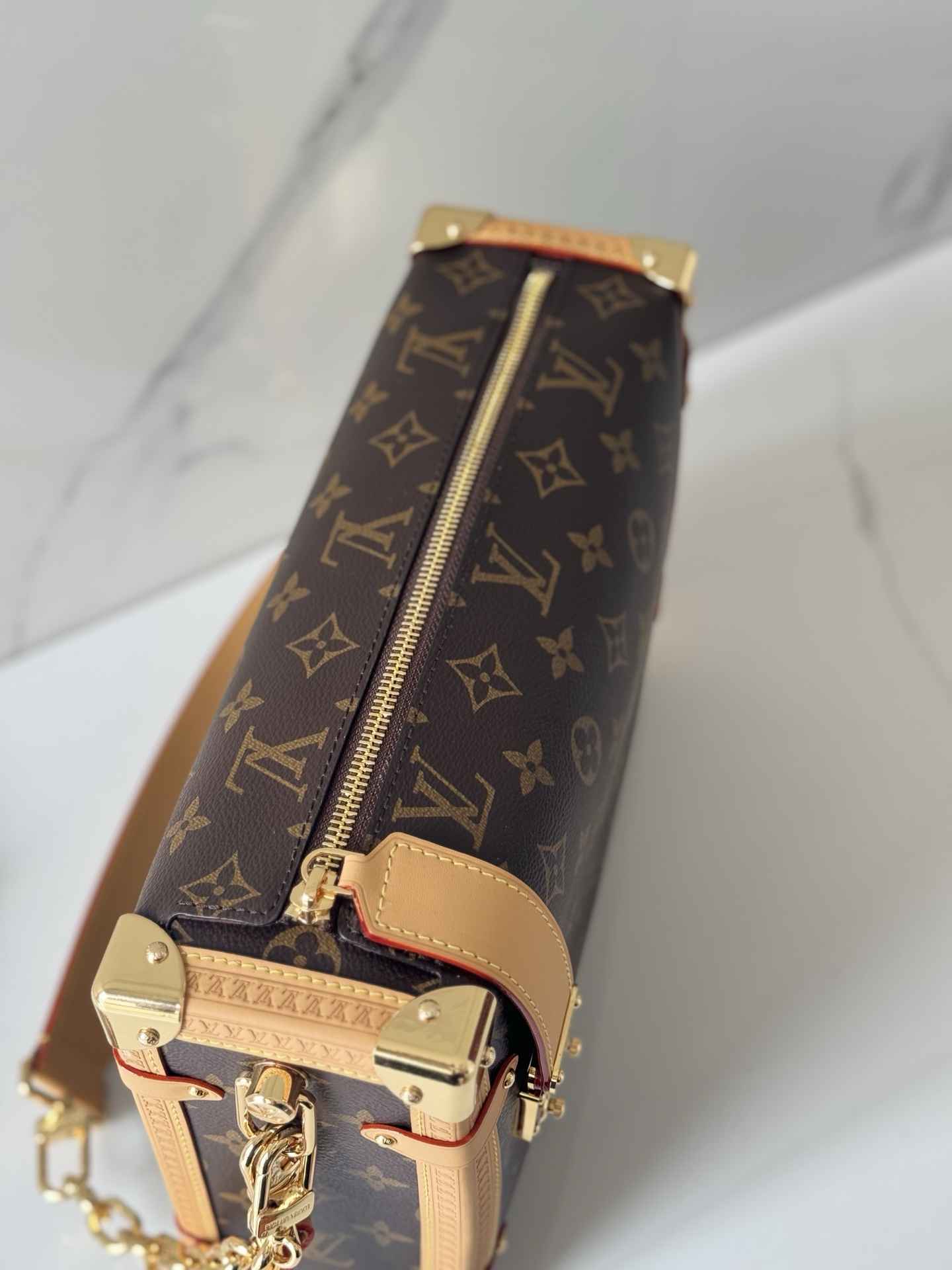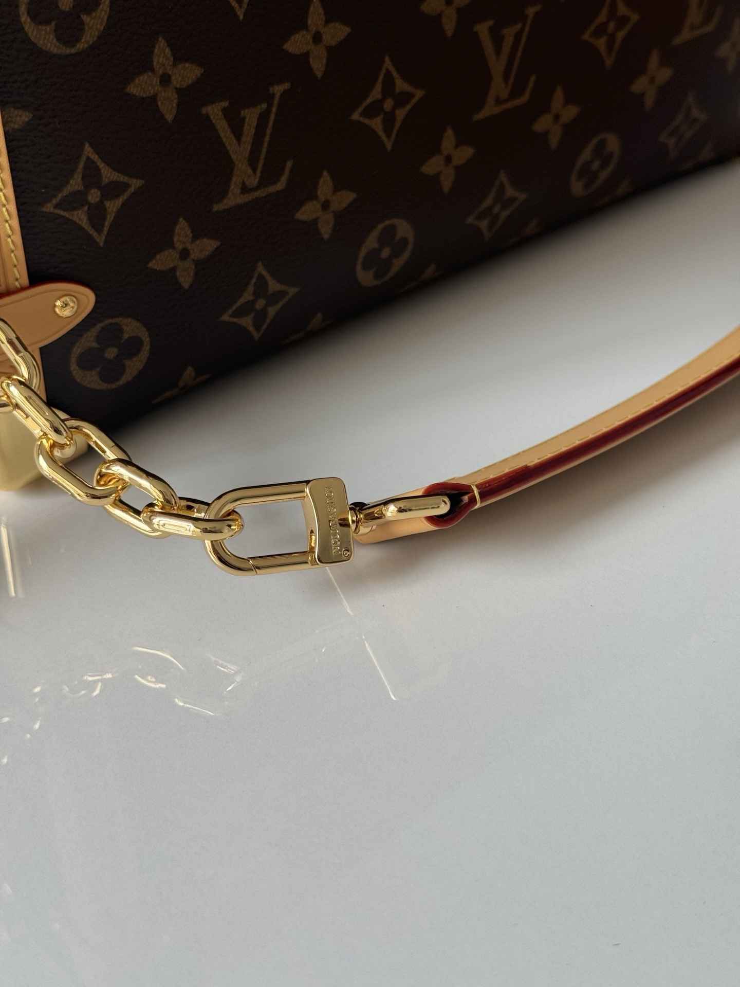 包型特点:采用Monogram帆布与撞色皮革饰边组合,搭配莹亮金属件和加长链条,顶部手柄和肩带可拆卸,支持手拎、肩背或斜挎多种背法。硬箱风格包角和S-lock锁扣强化了品牌辨识度。