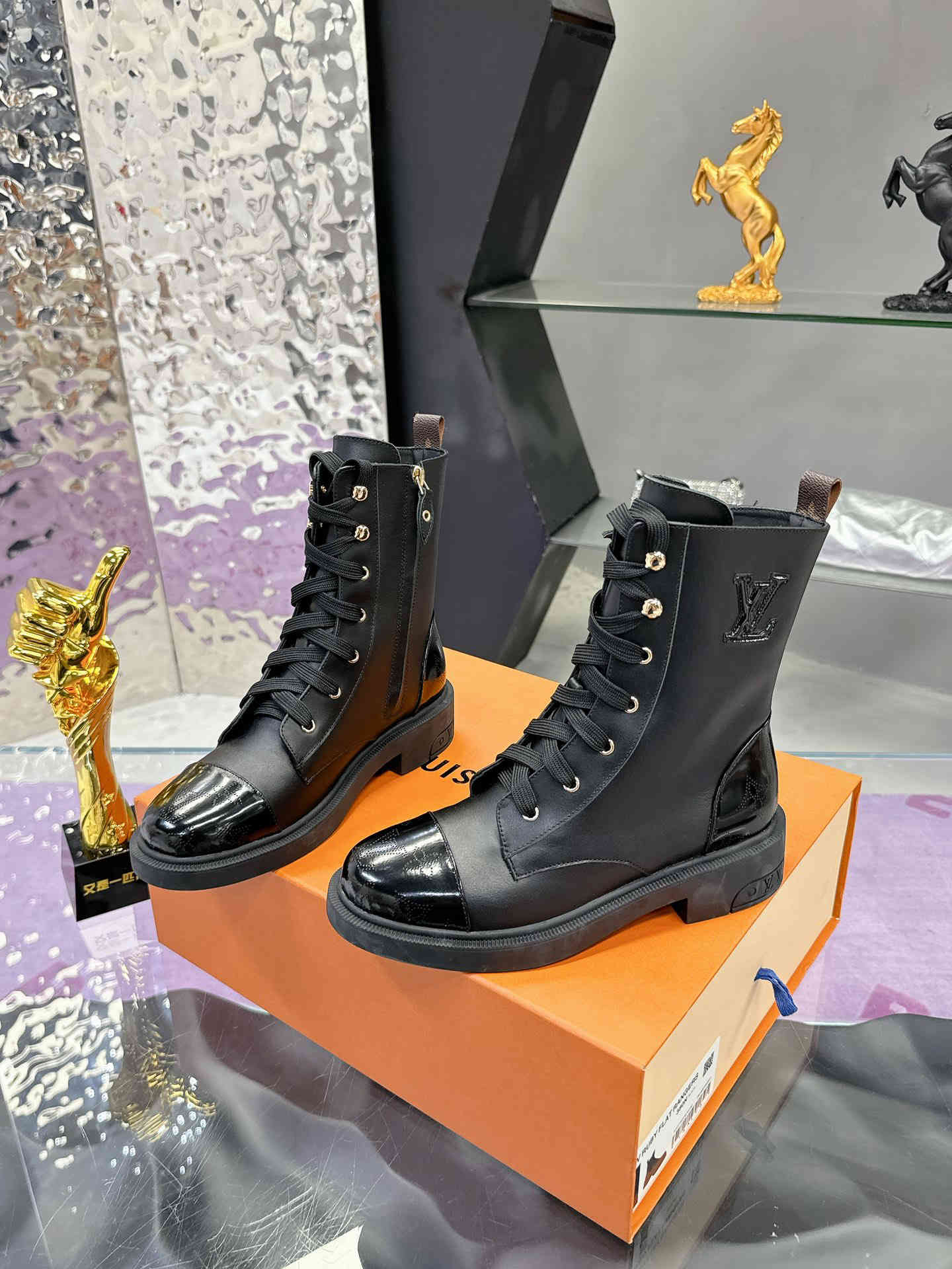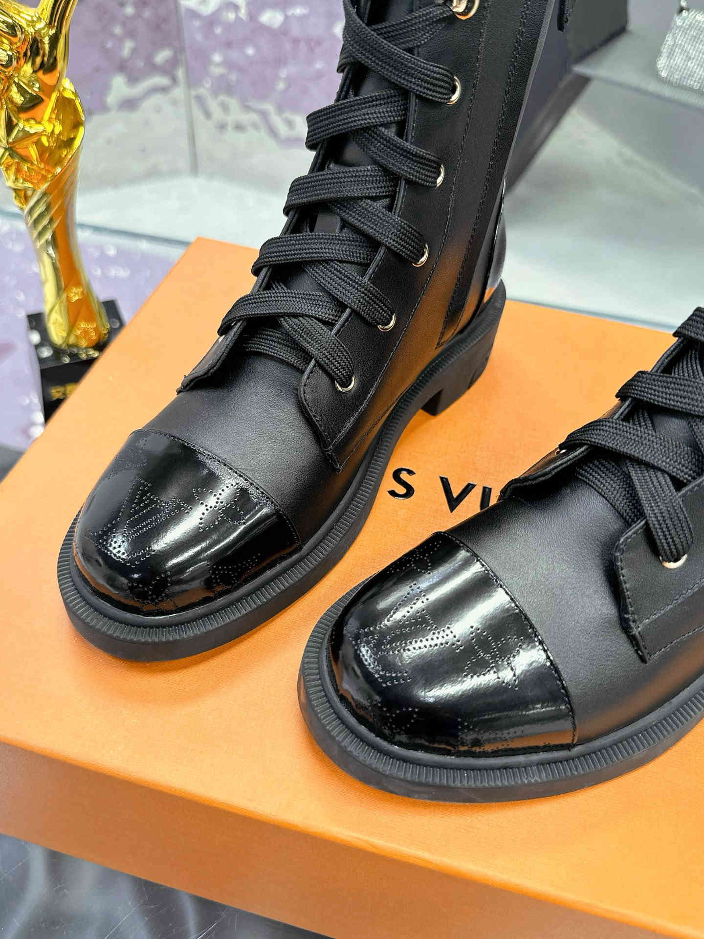 各大明星网红走秀款,百年经典,工艺精湛,上脚舒适 本款 平底靴以柔滑牛皮革彰显军旅风格,令人瞩目Monogram 图案穿孔点亮鞋头和后部。大小各异的 字母分饰轻盈橡胶外底和鞋侧,织物鞋带和 Monogram 帆布后袢带完善细节。