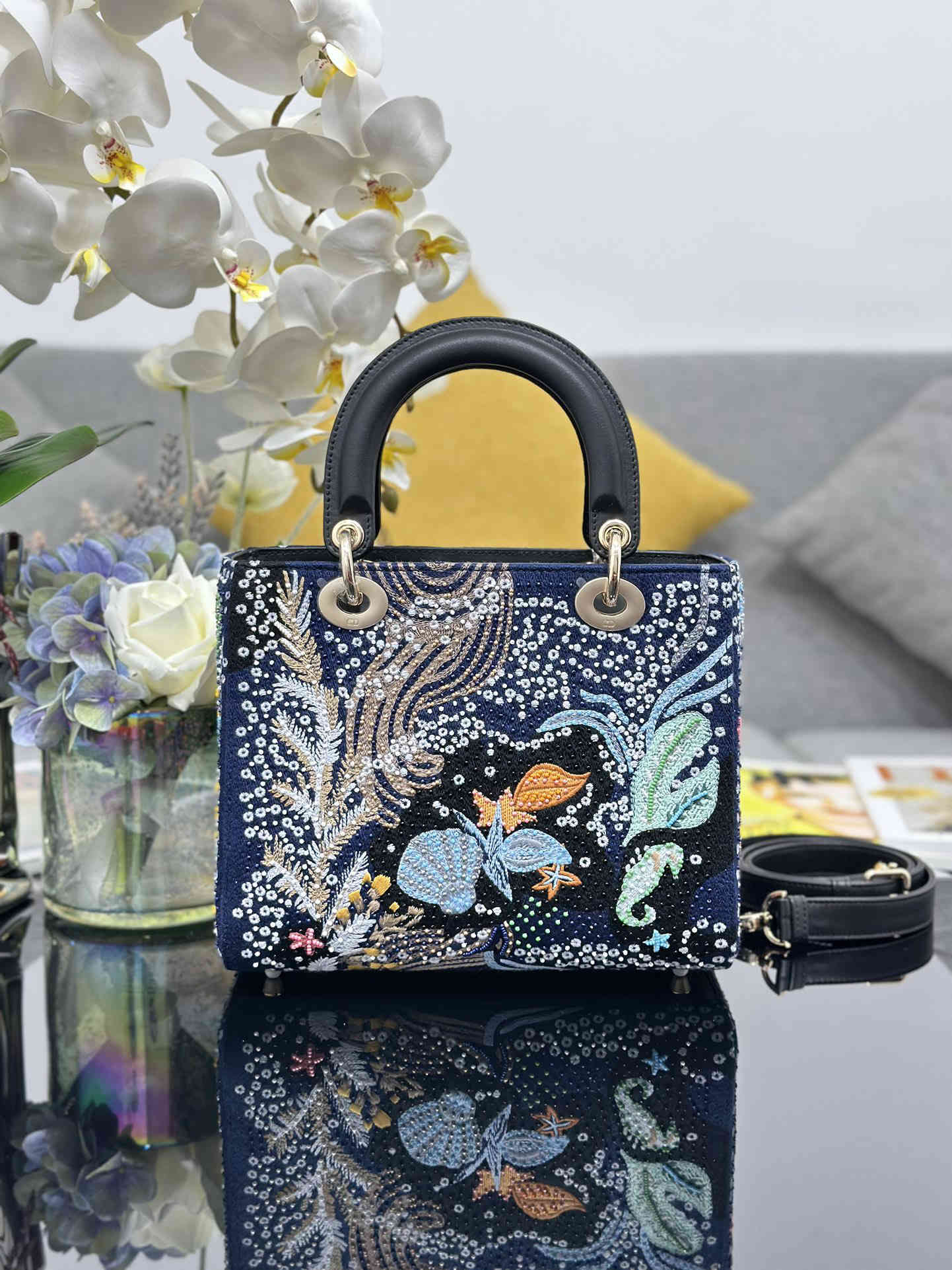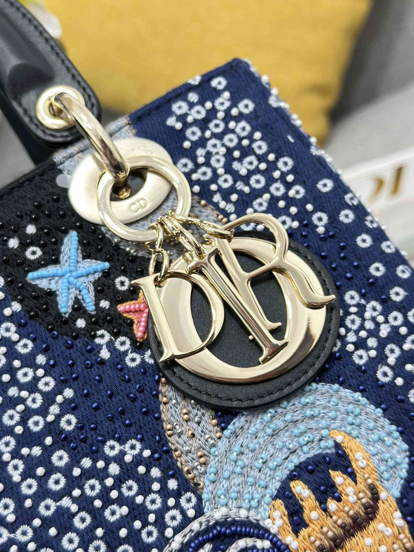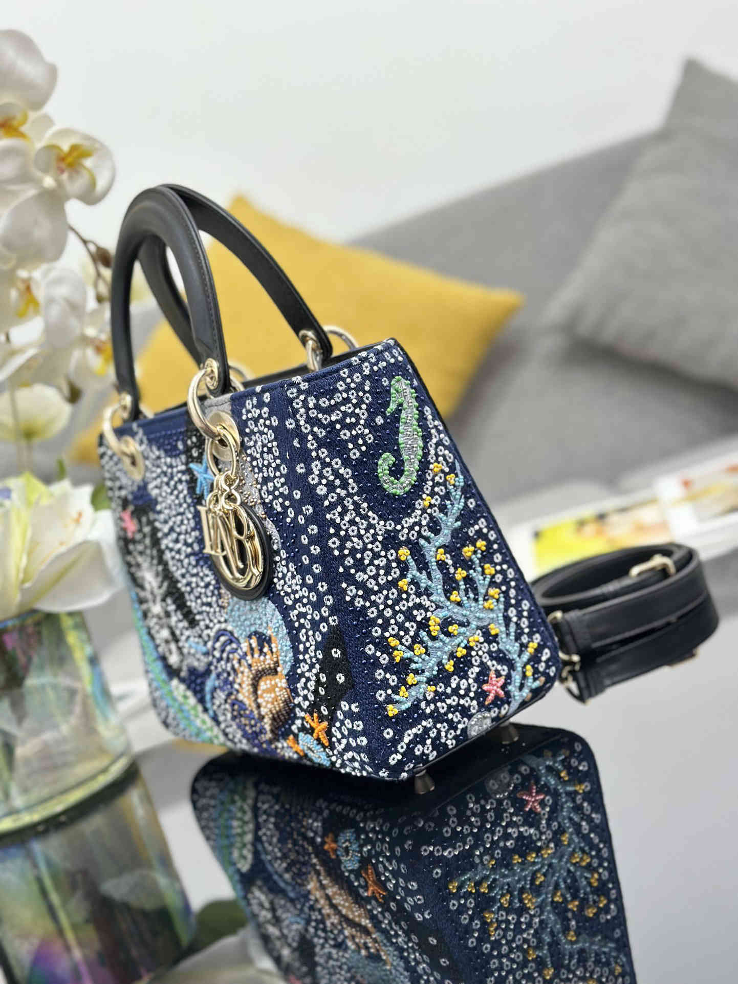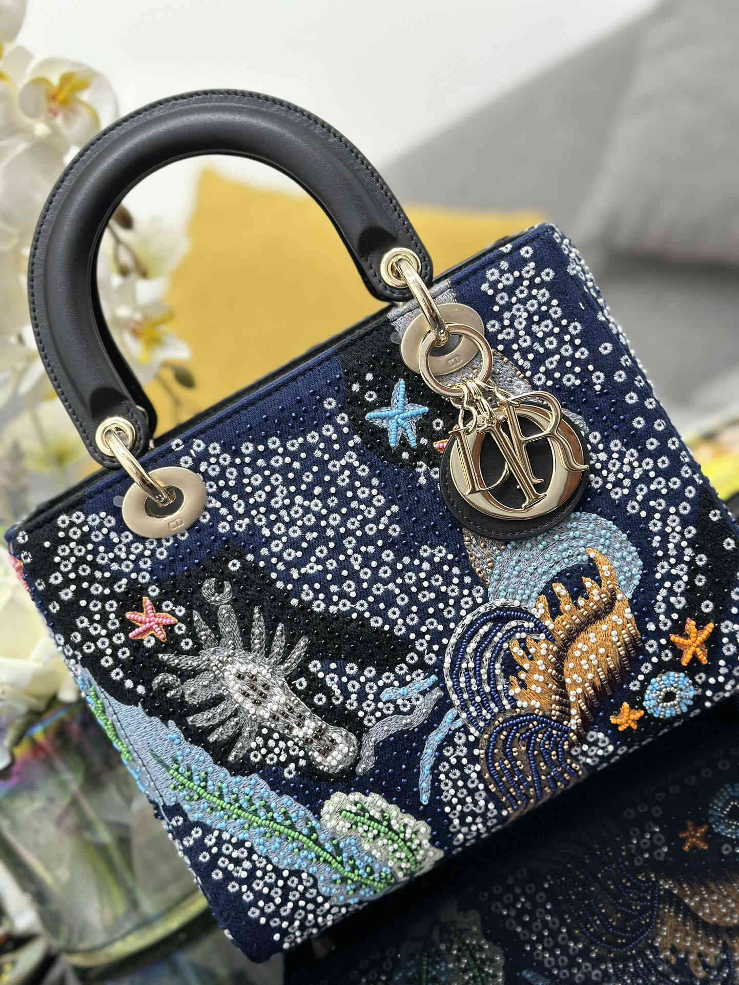 Lady Dior 五格刺绣海底珠子,典雅和美丽的真知灼见。时髦且富有女性魅力,经久不衰却又现代时尚。采用精致的珠饰牛皮革制成,搭配当季的图案,流露出 Maria Grazia Chiuri 对神秘感的迷恋。手袋采用海底装饰,预示着好运与欢乐。浅金色的标志性"D.I.O.R."吊饰点缀其 A 字型的轮廓。这款中号手袋采用可拆卸的肩带。可调节的皮革肩带,内部拉链口袋,可手拿、肩背或斜挎,尺寸:24 x 20 x 11 厘米,
