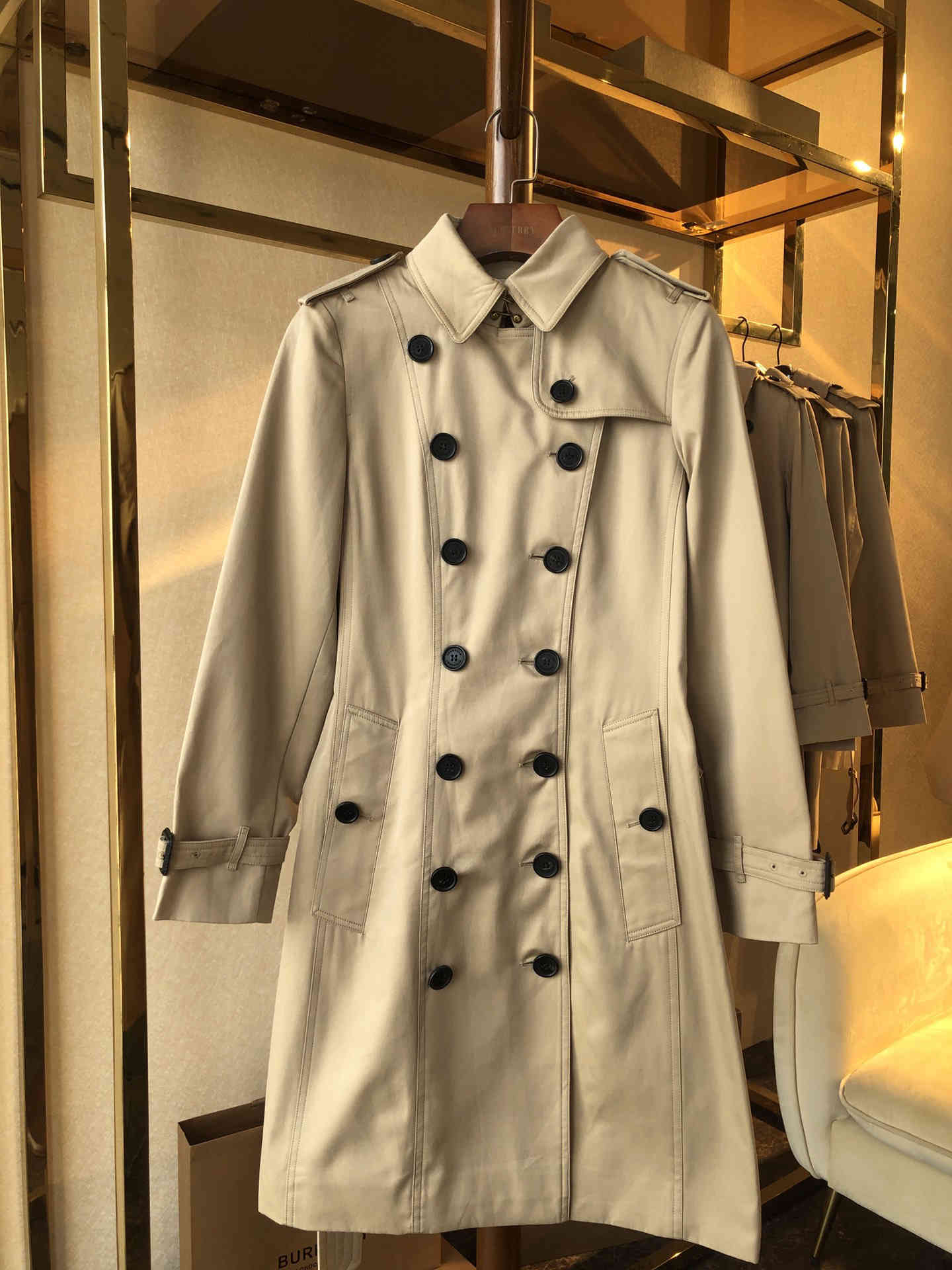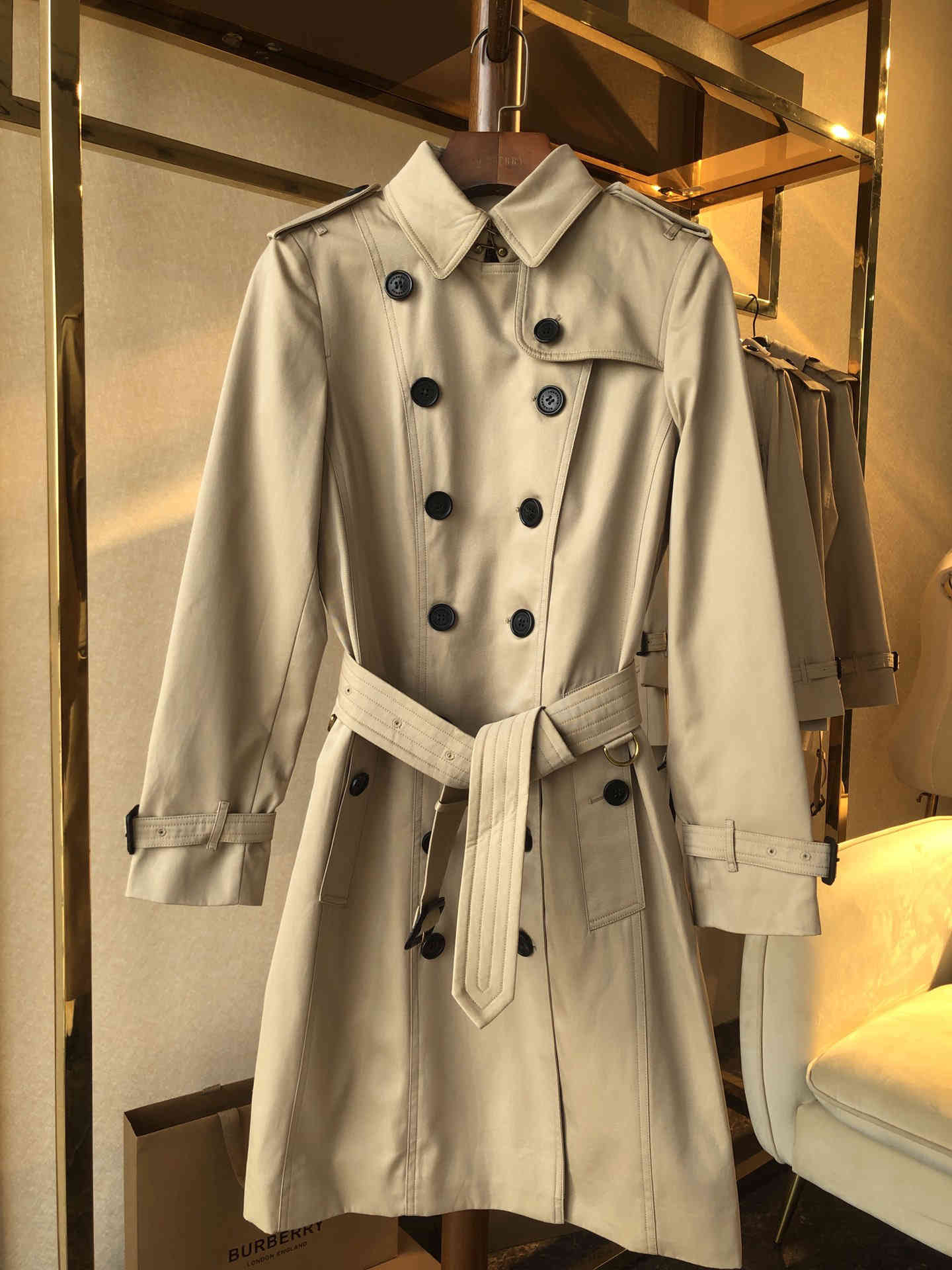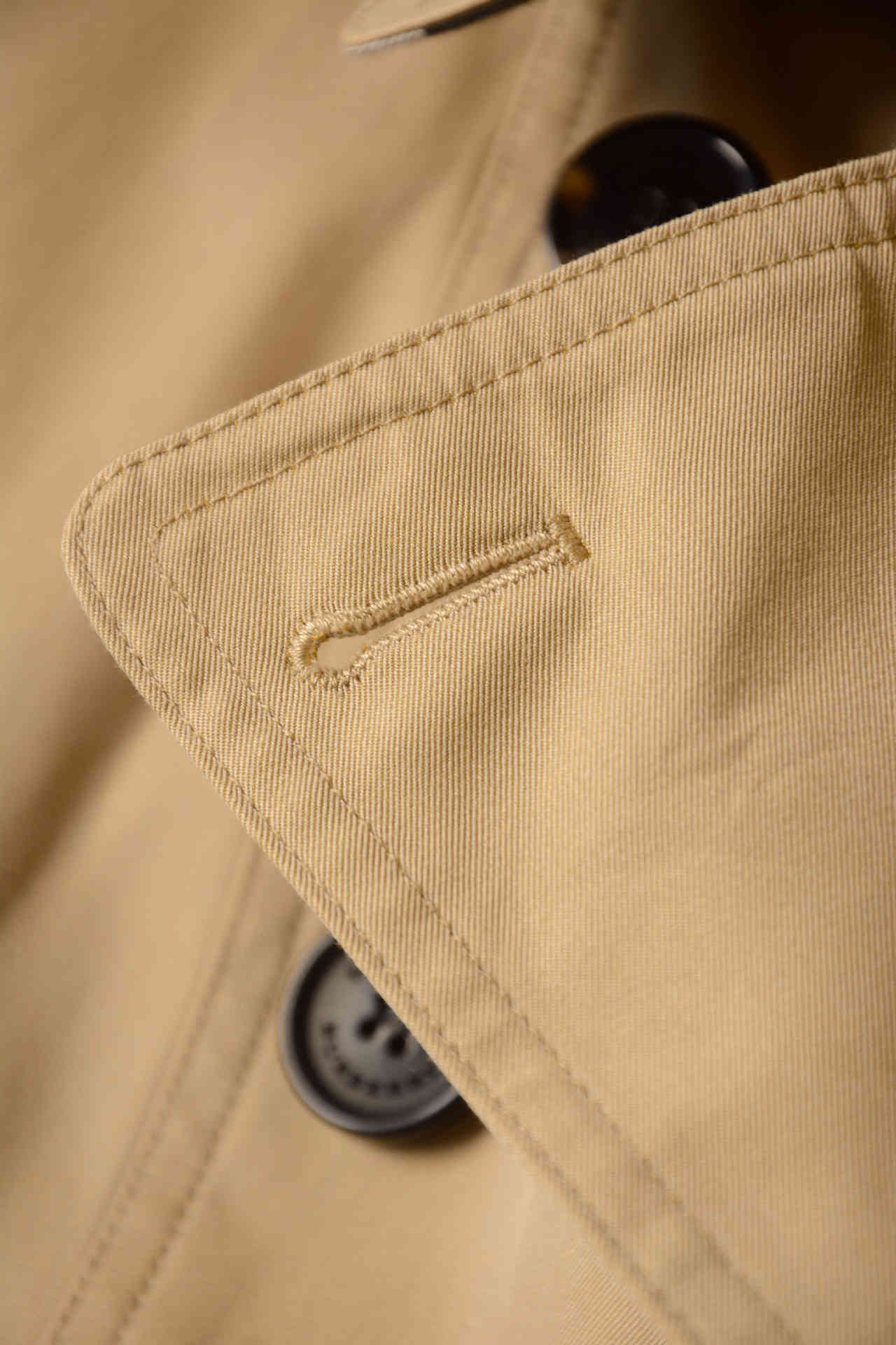 原版牛角扣真皮扣,风衣臻选防雨棉质嘎巴甸(Gabardine)于英格兰精裁而成,该面料由Thomas Burberry于1879年独创发明。