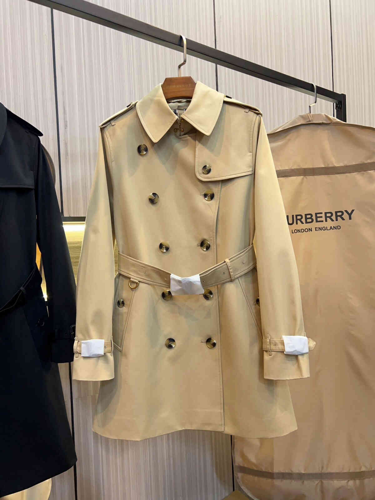 细节决定品质:面料内外防水,原版五金,精致对版衣标,腰带对版切割线(必须有)!天然树脂-“N”字扣,细致车工!