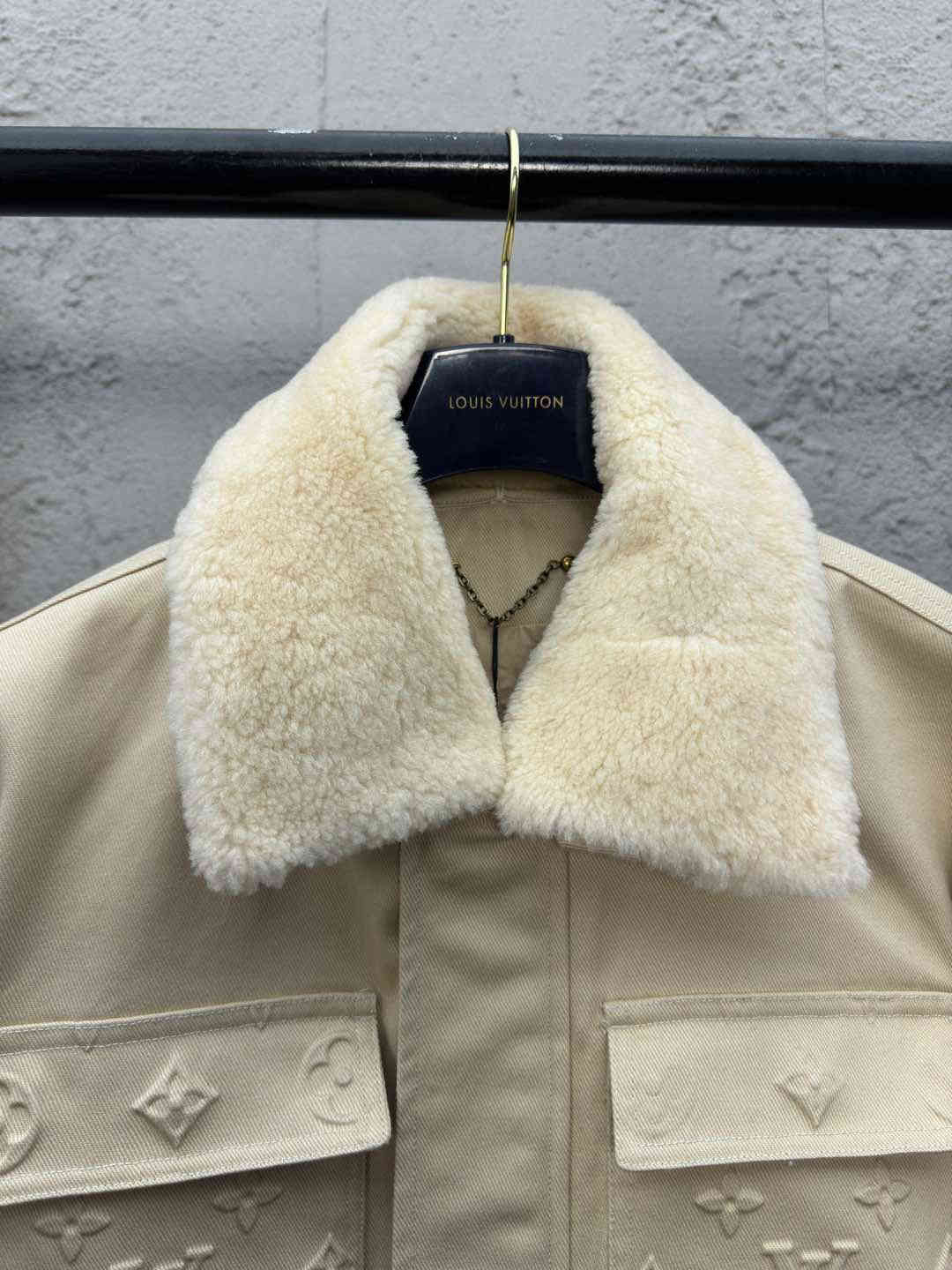 Monogram 图案,呈现创意交叠效果,搭配全内衬和可拆卸羊毛皮革衣领。整体走线平直细腻 面料舒适柔软 颜色一致无色差