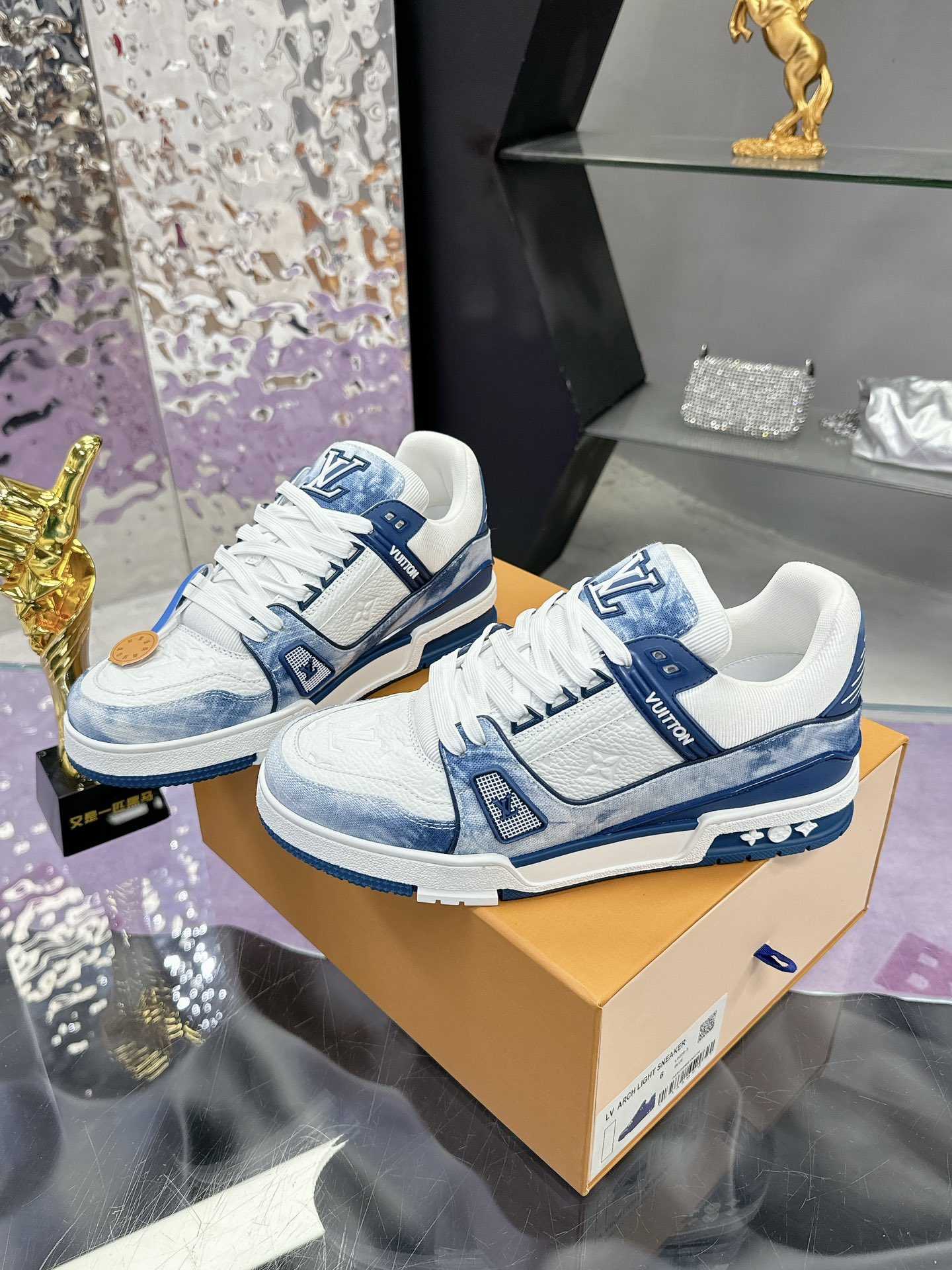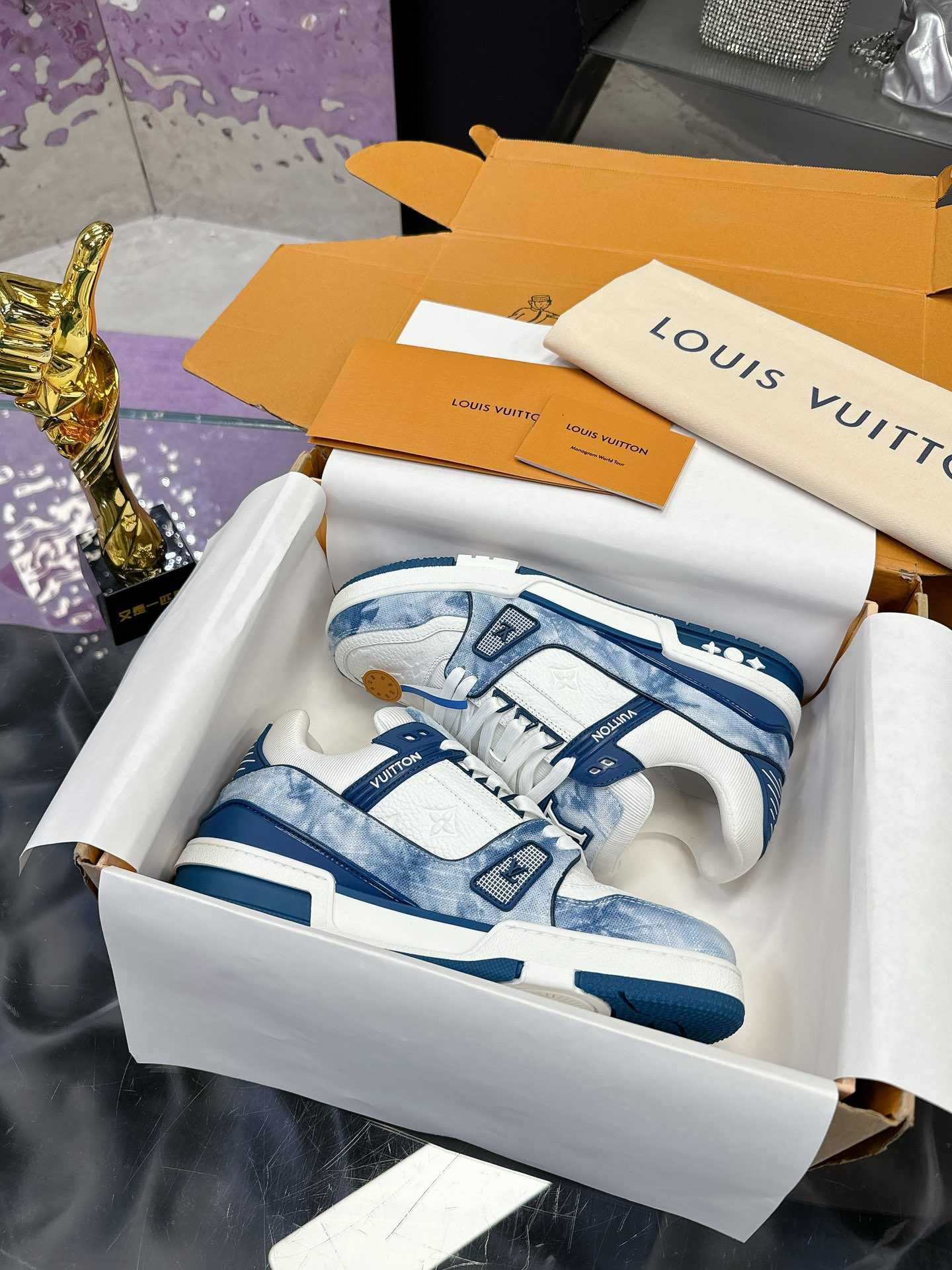采用头层牛皮制成,进口定制专用印花牛仔布包裹,粗鞋带系带设计,侧面带 Monogram 大印花, 鞋舌及后跟”lv 54“徽章点缀,橡胶外底饰有 Monogram 花卉, 网布内里棉垫脚,舒适性一如既往的达到极致,精品传承,品质至上,值得拥有!